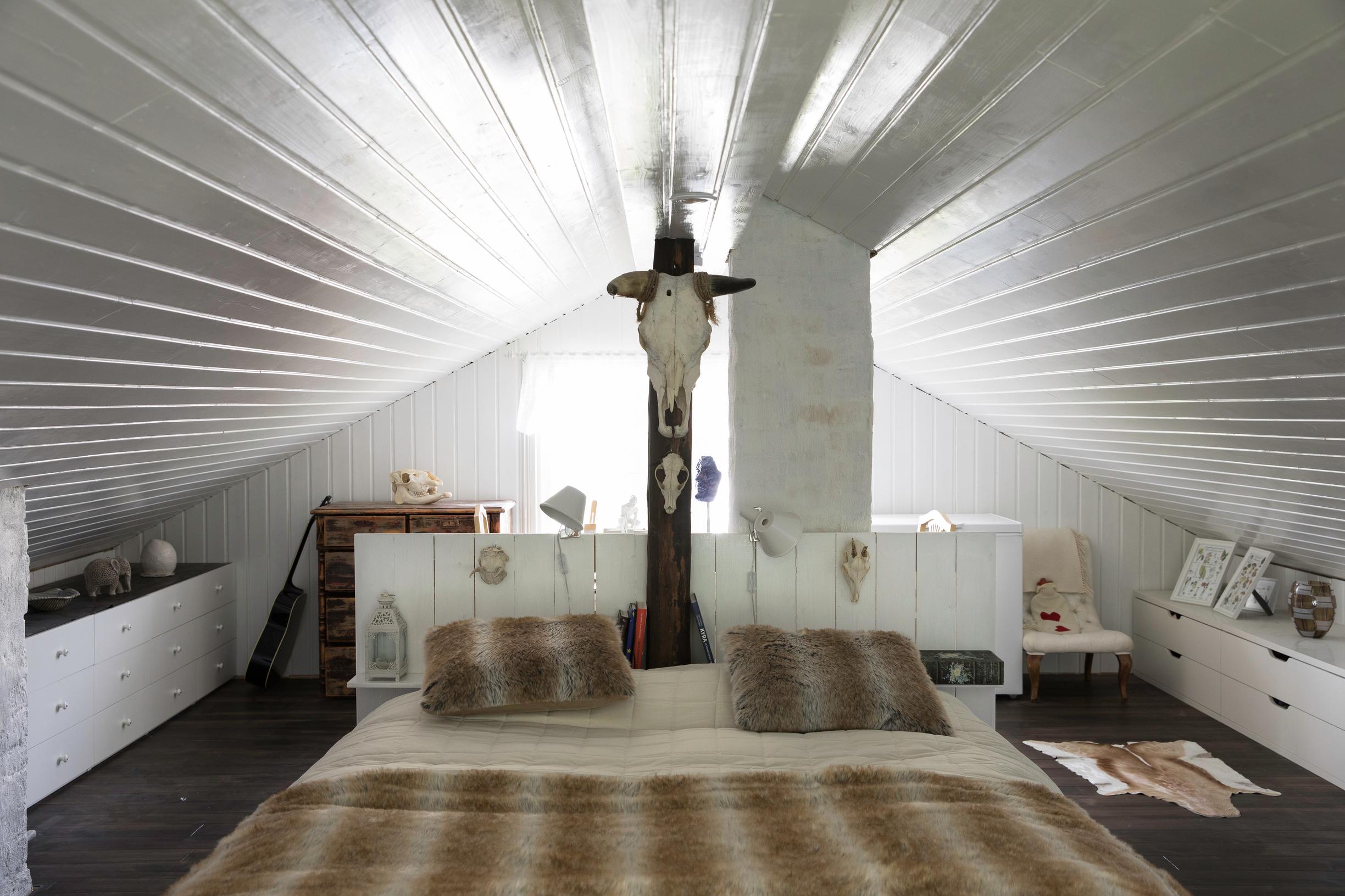 Rakastamme kesävierashuonettamme ulkorakennuksessa. Siellä asumme aikaisesta keväästä myöhään syksyyn. Vasta yöpakkaset ajavat meidät sisään. Huoneesta tuli juuri sellainen kuin halusimme. Se on nimeltään Satula, peti ja puuro.