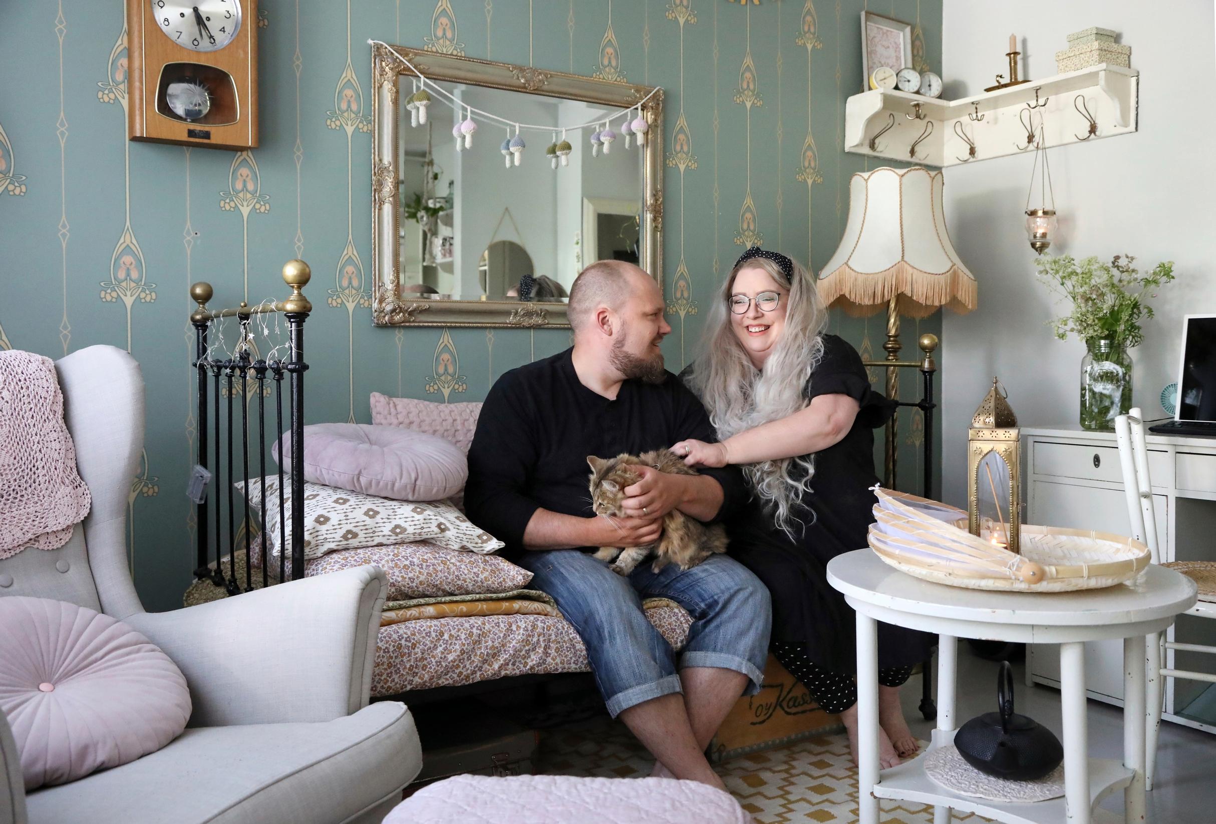 Modernin rivitalon päätyhuoneisto saattaa ulkoa näyttää tavanomaiselta, mutta kun astuu sisään Jaana ja Jarkko Sorsan luo, se yllättää ihanasti: kotiin on luotu pienellä budjetilla ihastuttava, nuorekas mummolatunnelma. Pariskunnan kanssa kotona tassuttelevat myös kissarouvat Kylli ja Irmeli.