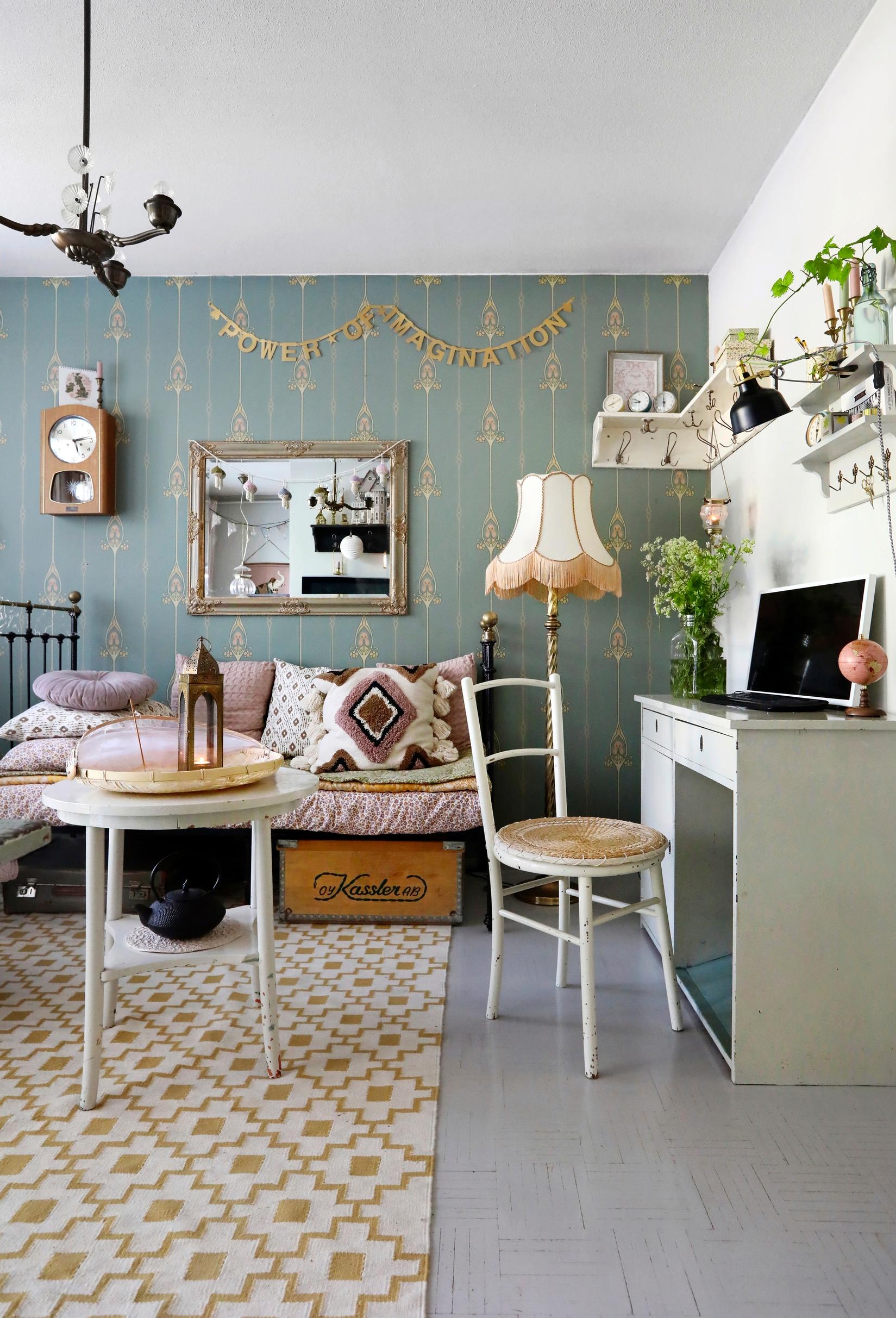 42 neliötä tulvillaan modernia mummolaromantiikkaa! Jaanan ja Jarkon rivitalokaksio on iloinen sekoitus pastellisävyjä ja kirpparilöytöjä