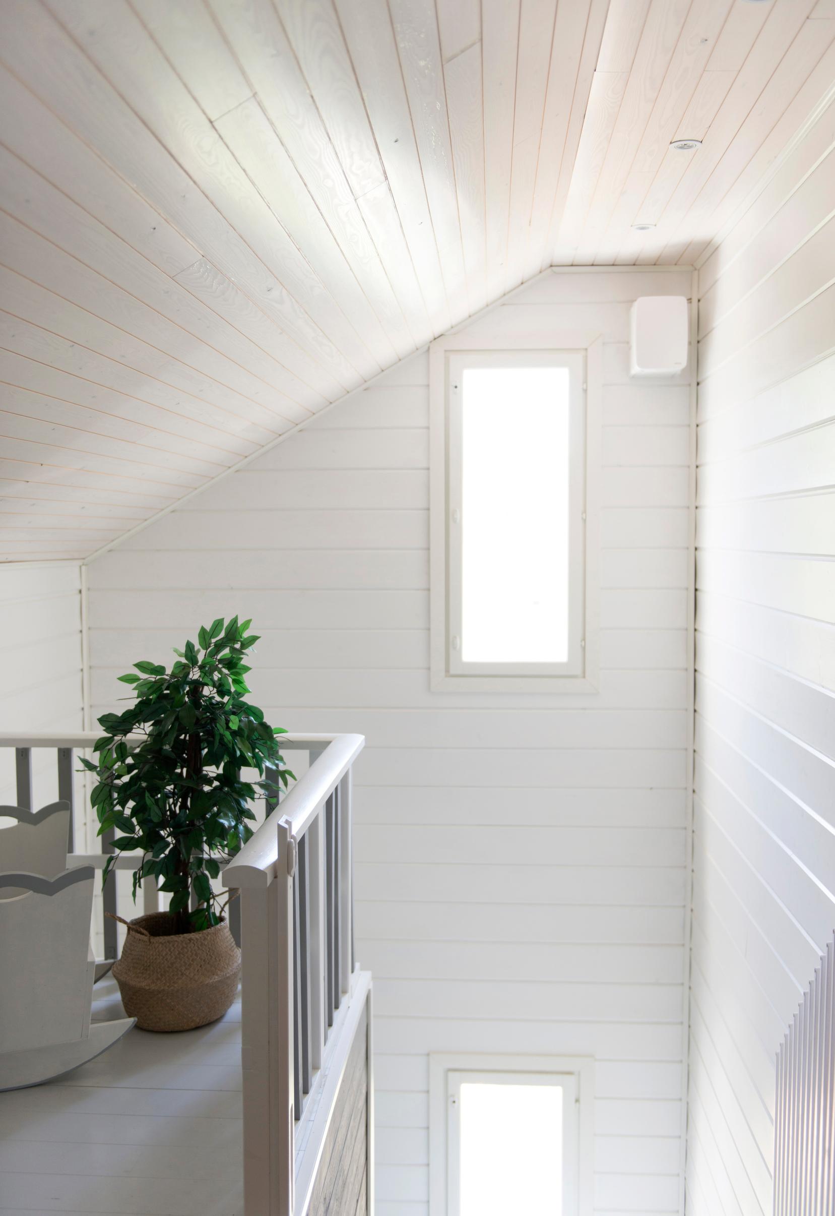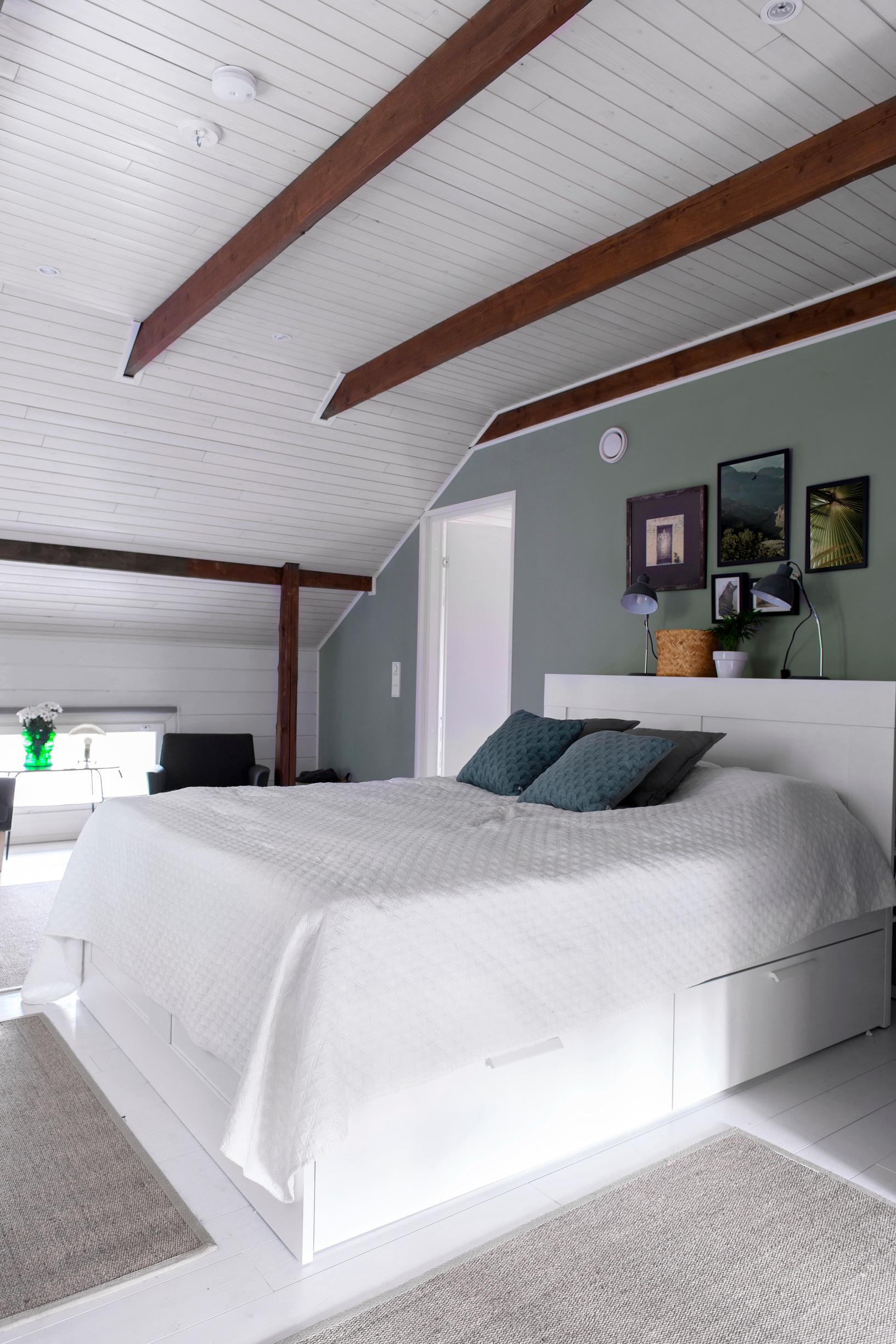 Makuuhuone ja lastenhuone ovat yläkerrassa. Makuuhuoneemme on tehty kylmästä vinttitilasta. Huone on seesteisyytensä takia lempipaikkani talossa, siellä minäkin saan päiväunista kiinni. Kompaktissa alakerrassa ovat iso tupakeittiö ja vierashuone, joka toimii myös esikoisen leikkihuoneena.
