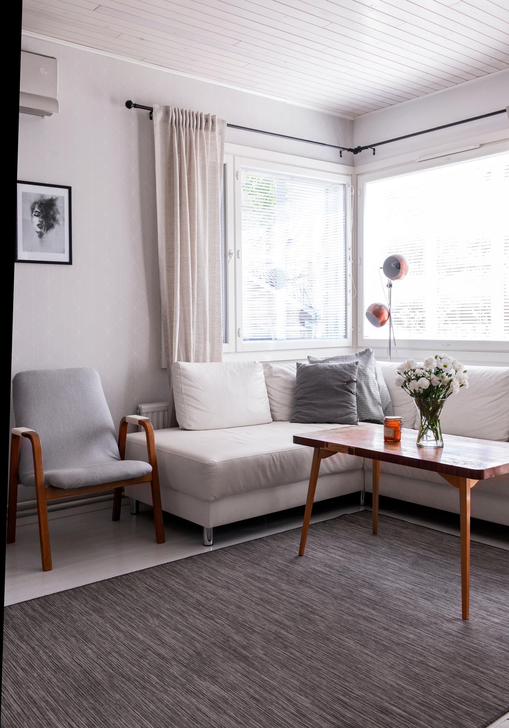 Vaihdoimme keittiön paikkaa ja yhdistimme wc- ja suihkutilat, mutta muuten pyrimme säilyttämään tilat samanlaisina. Maalasimme ja tapetoimme. Lastulevyn alta löytyi upea lautalattia, jonka kunnostimme. Kaikki alkuperäiset ovet jätimme käyttöön ulko-ovea lukuun ottamatta.