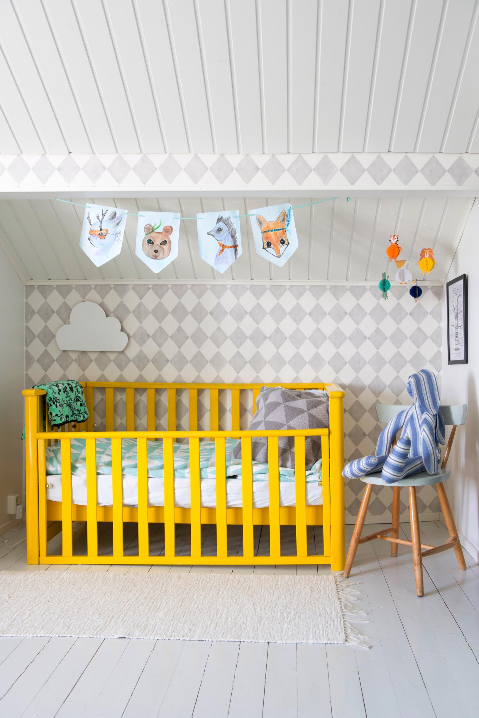 Halusin lastenhuoneesta värikkään ja leikittelevän. Väreinä on kirkkaankeltaista ja turkoosia. Tein itse huoneeseen matot. Ystäviltä ostettu vanha, keltaiseksi maalattu pinnasänky on niin iso, että se kestää mukana yli vauva-ajan.