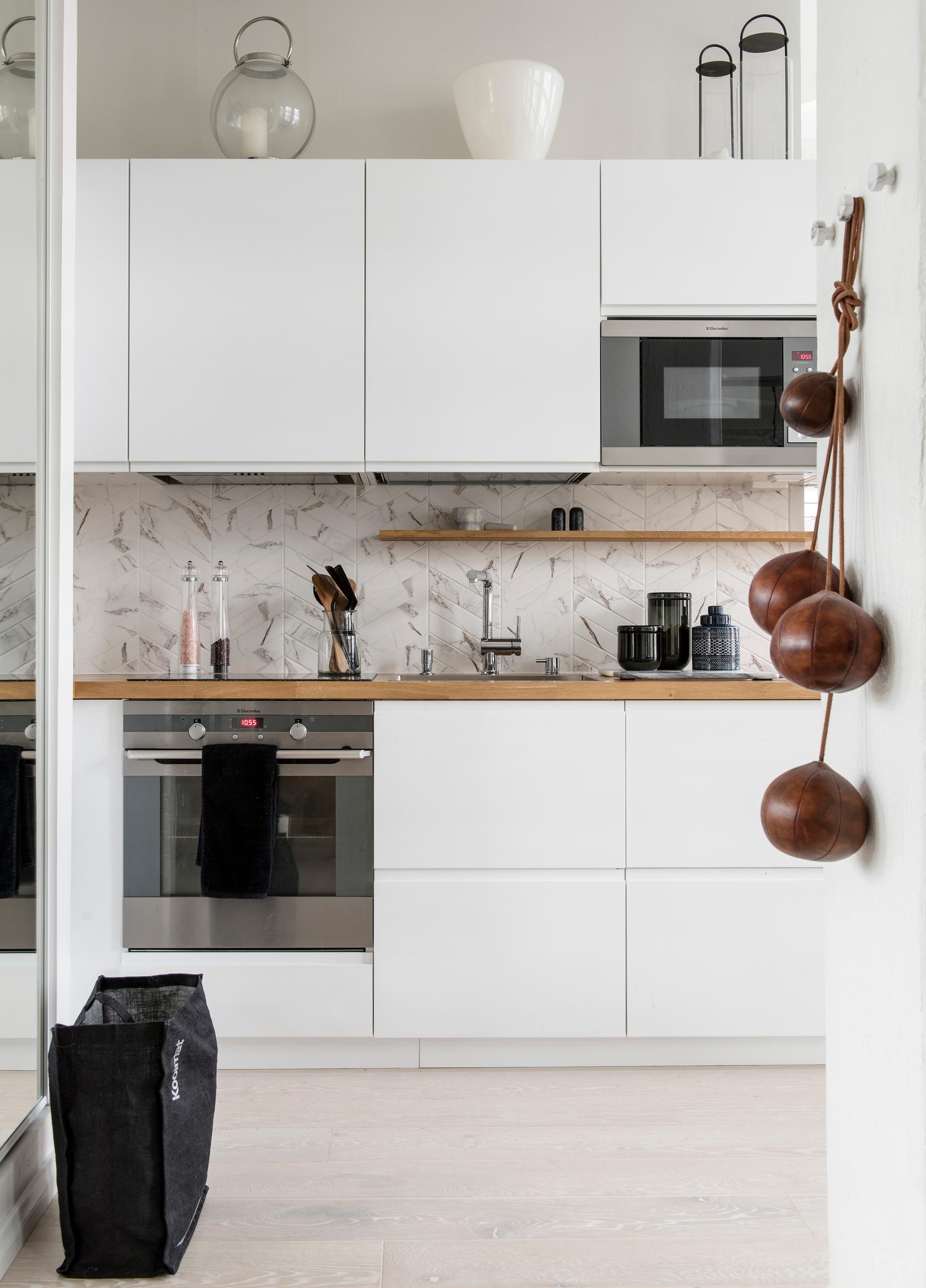 Remontissa keittiön yläkaappeja jatkettiin kulman taakse olohuoneeseen asti. Valkoista keittiötä elävöittävät erilaiset materiaalit. Välitilaan on chevron-ladottu marmorimaista laattaa, ja itse tehdyt puuhylly ja -taso pehmentävät ilmettä. Leikkuulauta on tuotu Kreikasta. Marmoritarjotin on Ellokselta, mortteli Stockmannilta ja purkit ja sirottimet H&M Homen.