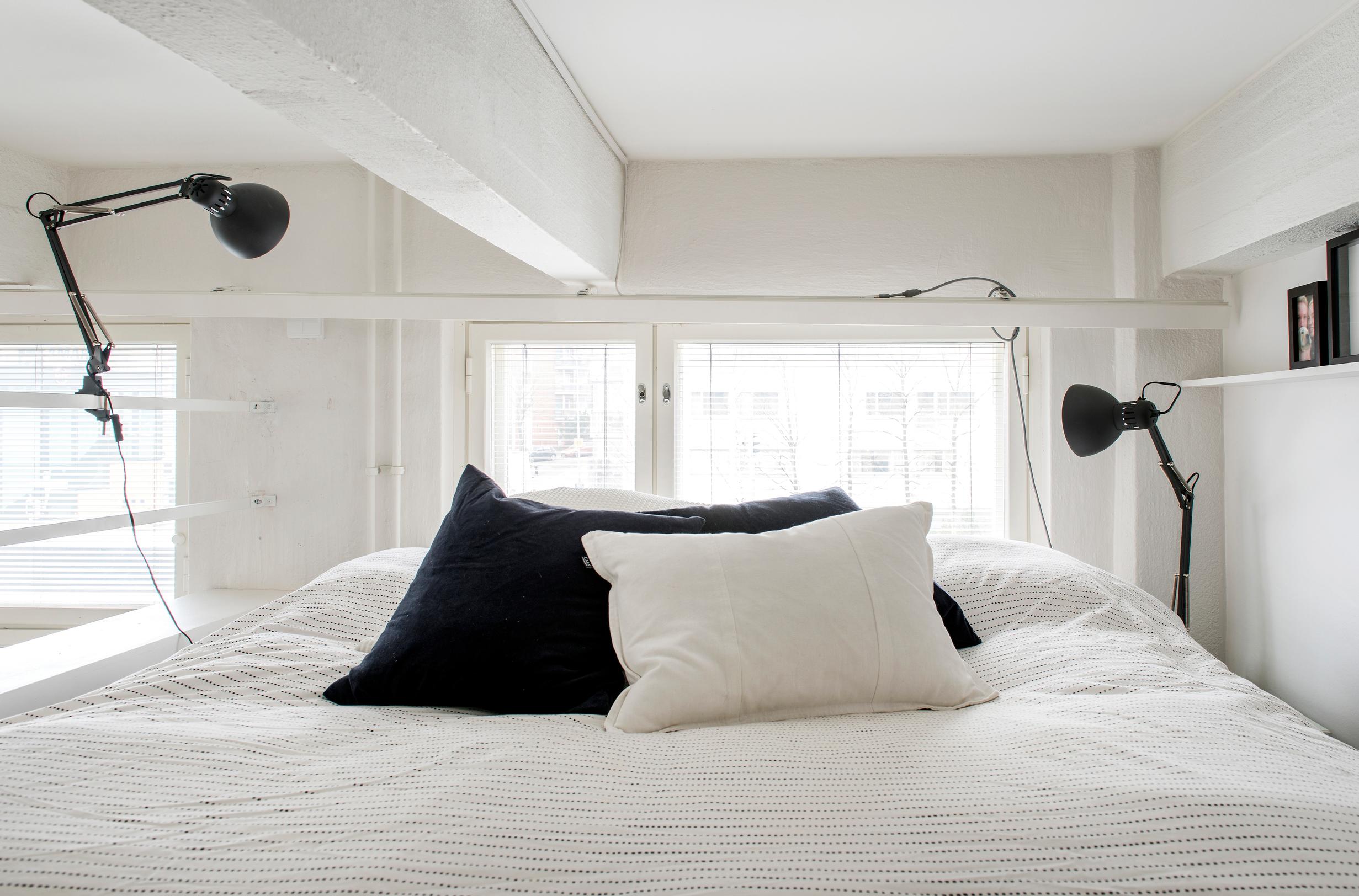 Vanhempien makuutila sijaitsee parvella, jonne johtavat kauniit mustaksi maalatut puuportaat. Lukuvalaisin on Ikeasta. Päiväpeitteen virkaa hoitaa parivuoteen peitto, jossa on tuplapussilakana.