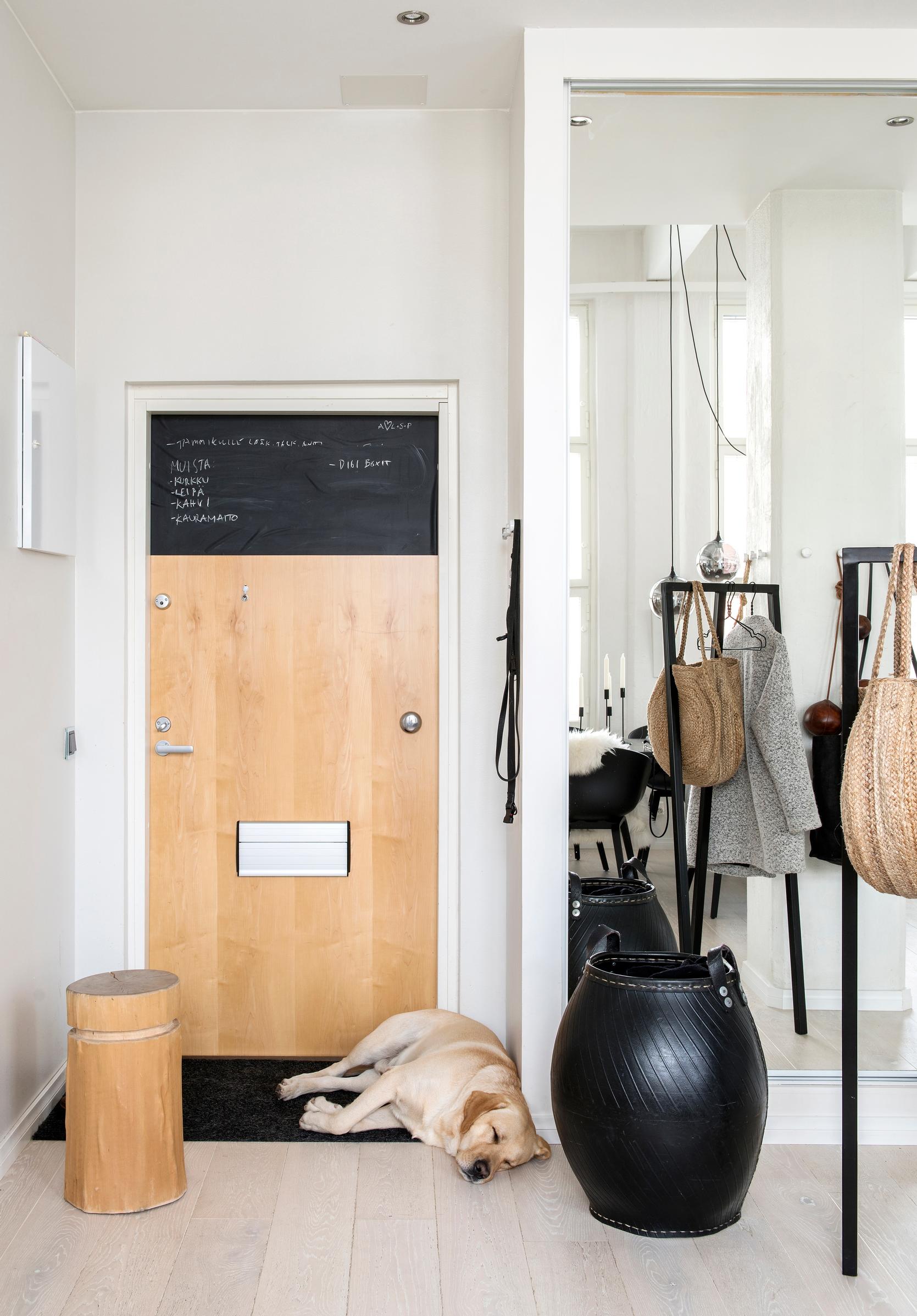Eteisestä tullaan suoraan keittiöön. Korkean liukuovikaapiston ohella Hayn Loop Stand -naulakko säilyttää ulkotakit ja kauppakassit, kumikori huivit. Ulko-oven sisäpinta on tehostettu liitutaulutarralla. Nyt siihen saa muistiin ostoslistan.