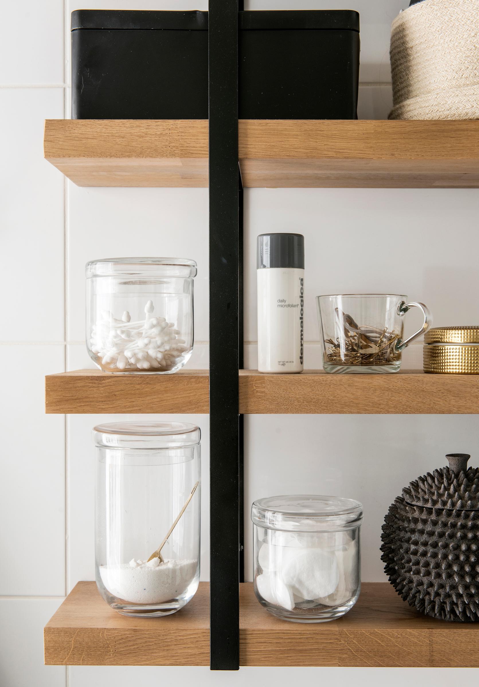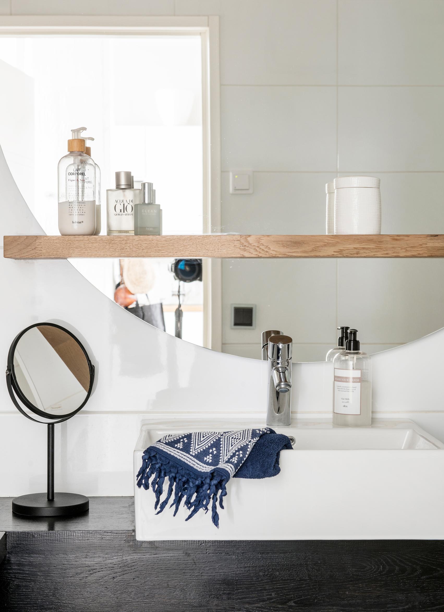 Kylpytilan peilihyllyn ja avohyllyn tammesta ja metallista Leena ja Antti ovat suunnitelleet ja toteuttaneet itse omiin tarpeisiinsa. Mitat on määritelty omien tavaroiden mukaan.