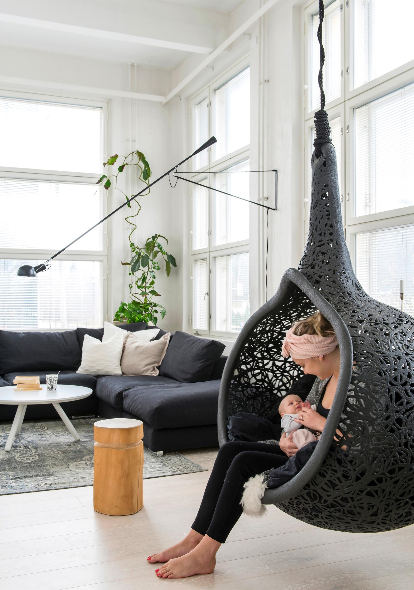 Riippukeinusta pari ei luovu. Siitä on tullut heidän lempipaikkansa, jossa on mukava myös syöttää Sofia-vauvaa ja heijailla hänet uneen. Loftiin Maffam Freeformin tuoli sopii, mutta joskus tulevassa kodissa se voi päätyä terassille. Sohvapöytä on itse tehty. Seinävalaisin on Flosin ja sohva Sotkasta.