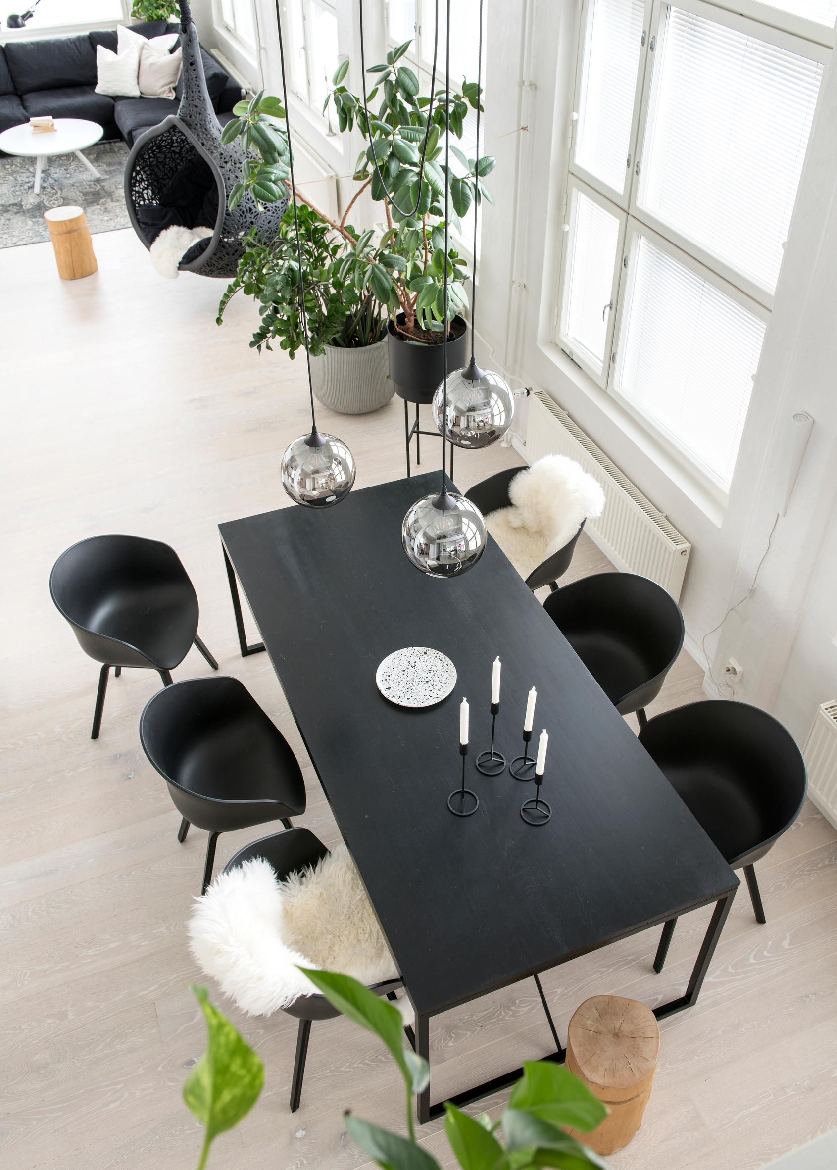 Pari toteutti ison ruokapöydän itse koulun pajalla. Se mitoitettiin illanistujaisia ja sukulaisten vierailuja varten, mutta remontissa ja vauva-arjessa illanistujaisia ei ole vielä ehtinyt montaa kertyä. Hayn About A Chair AAC22 -tuoleja on ostettu ajan saatossa lisää pöydän koon kasvaessa.