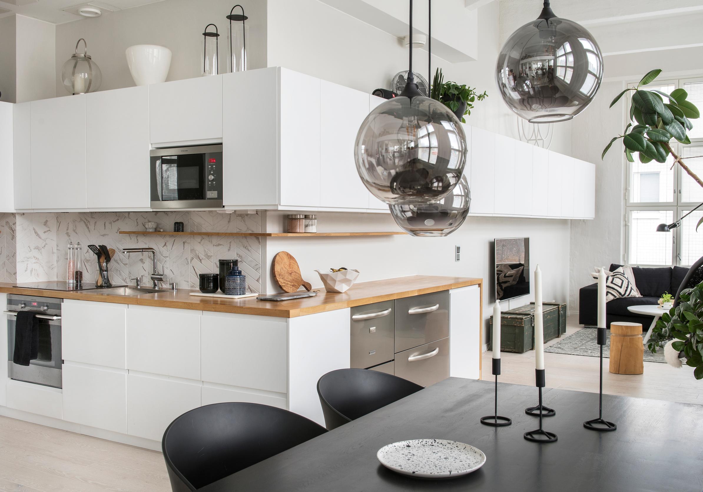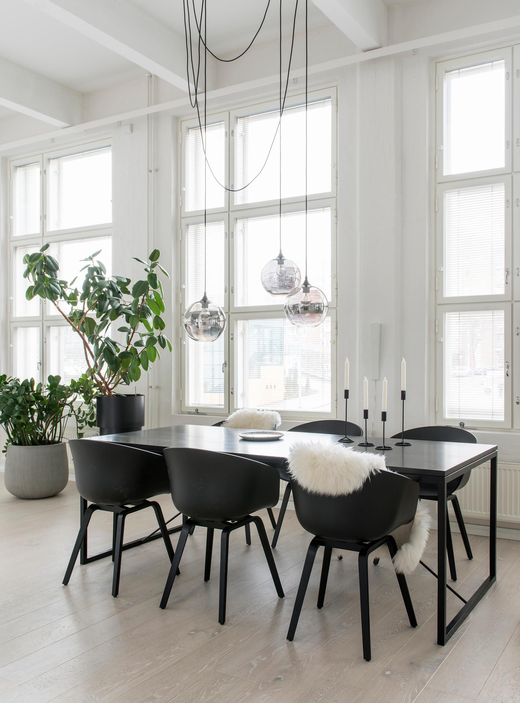Huonekorkeus on hyödynnetty rennolla valaisinsommitelmalla, jossa on House Doctorin Circle-valaisimia. Koska talo on suojelukohde, vastikkeeseen kuuluu ikkunoiden pesu ulkoapäin. Kynttilänjalat ovat H & M Homesta.