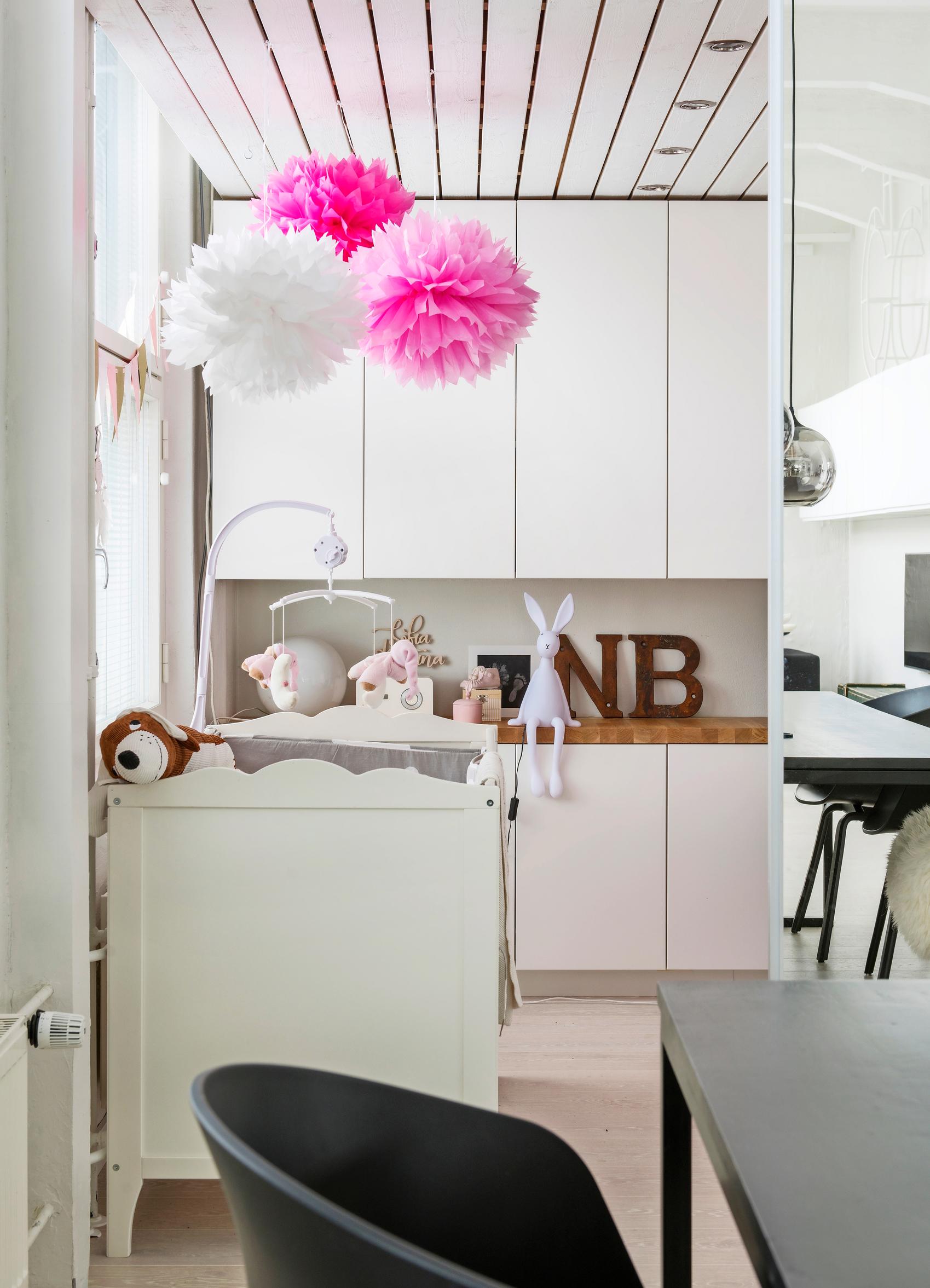 Sofia-vauvan soppi on sijoitettu parven alle pieneen huoneeseen, joka piiloutuu peilipintaisten liukuovien taakse. Tila toimii myös vaatehuoneena. Sofialle siellä on vasta pinnasänky. Hempeät koristeet ovat saaneet jäädä juhlien jäljiltä.