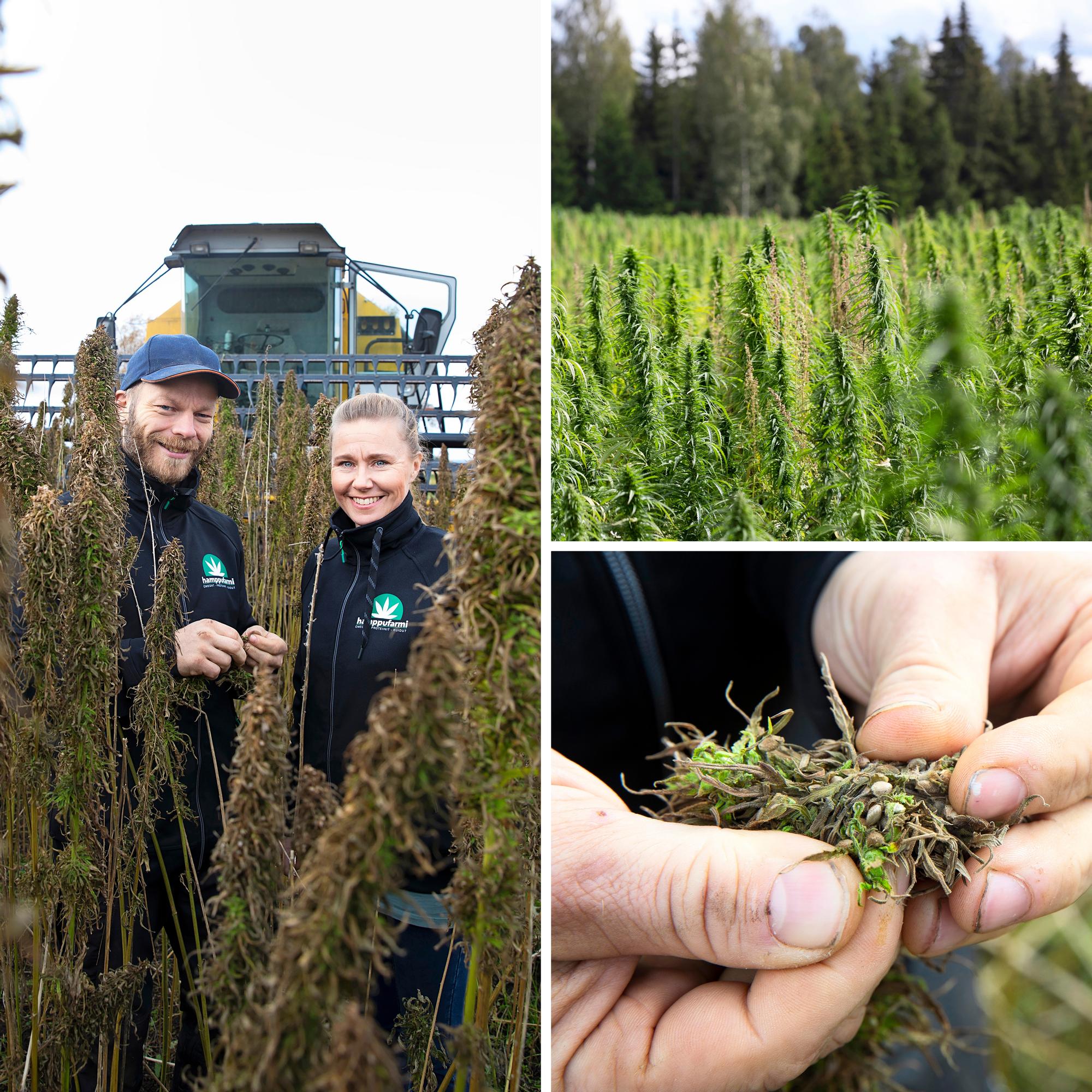 Hamppupellon parimetrinen, hiukan vihreältä teeltä tuoksuva kasvusto rehottaa jo hieman. On syyskuun loppu ja sadonkorjuuaika, joten Murtolan hamppufarmin viljelijäpari Ville Virtasella ja Virve Kettusella on kiire töihin leikkuupuimureineen ennen kuin sato päätyy parempiin suihin.