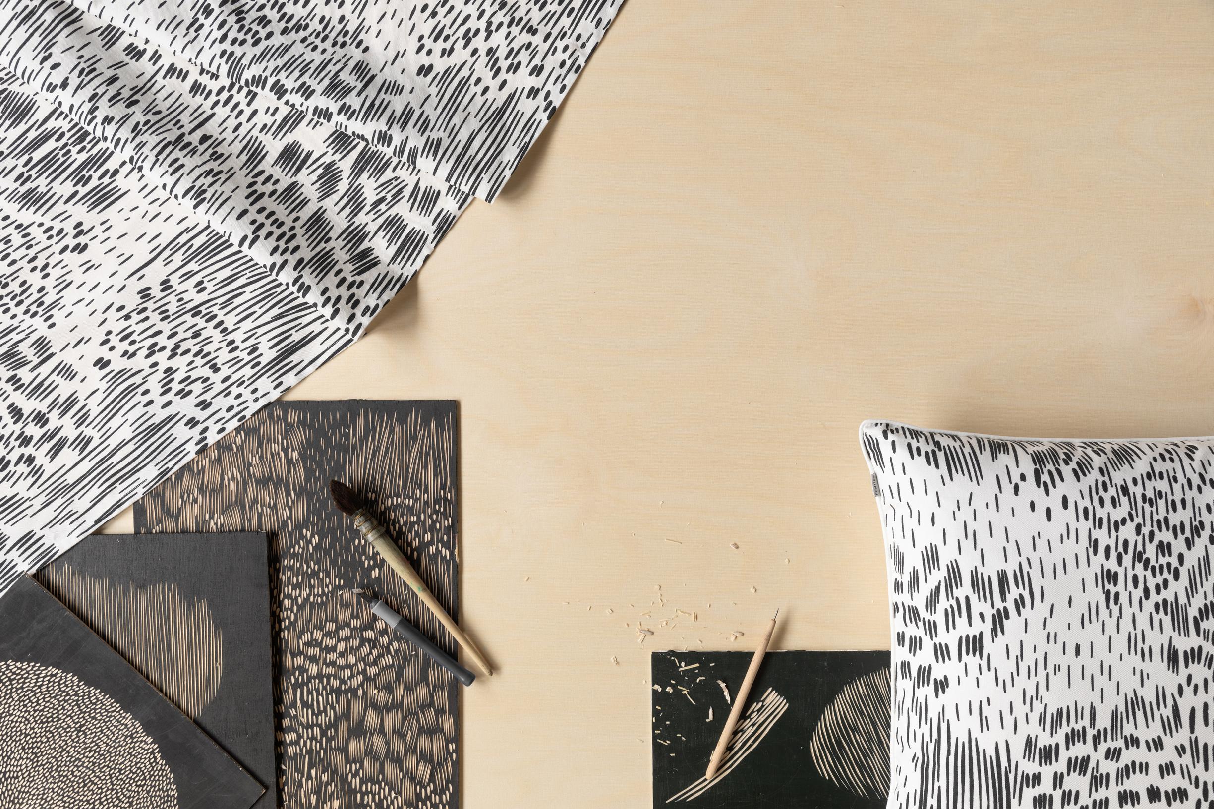 Graafinen mustavalkoinen tyyli sopii hienosti osaksi Pentikin mallistoa. Onhan kankaissa esiintyvät aiheet poimittu luonnosta, kuten yrityksen muissakin kuoseissa.