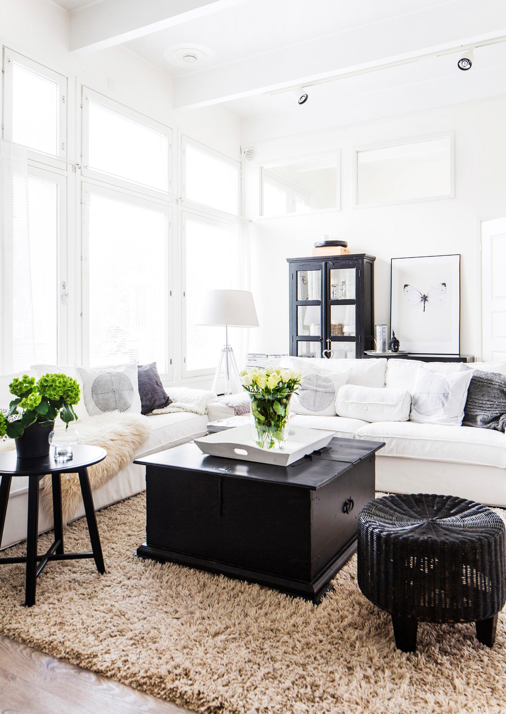 Skandinaavinen, selkeä olohuone toimii erityisen hyvin mustavalkoisena. Äkkiseltään voi kuulostaa tylsältä, mutta kaikkea muuta! Tässä 32 kodikasta toteutusta.