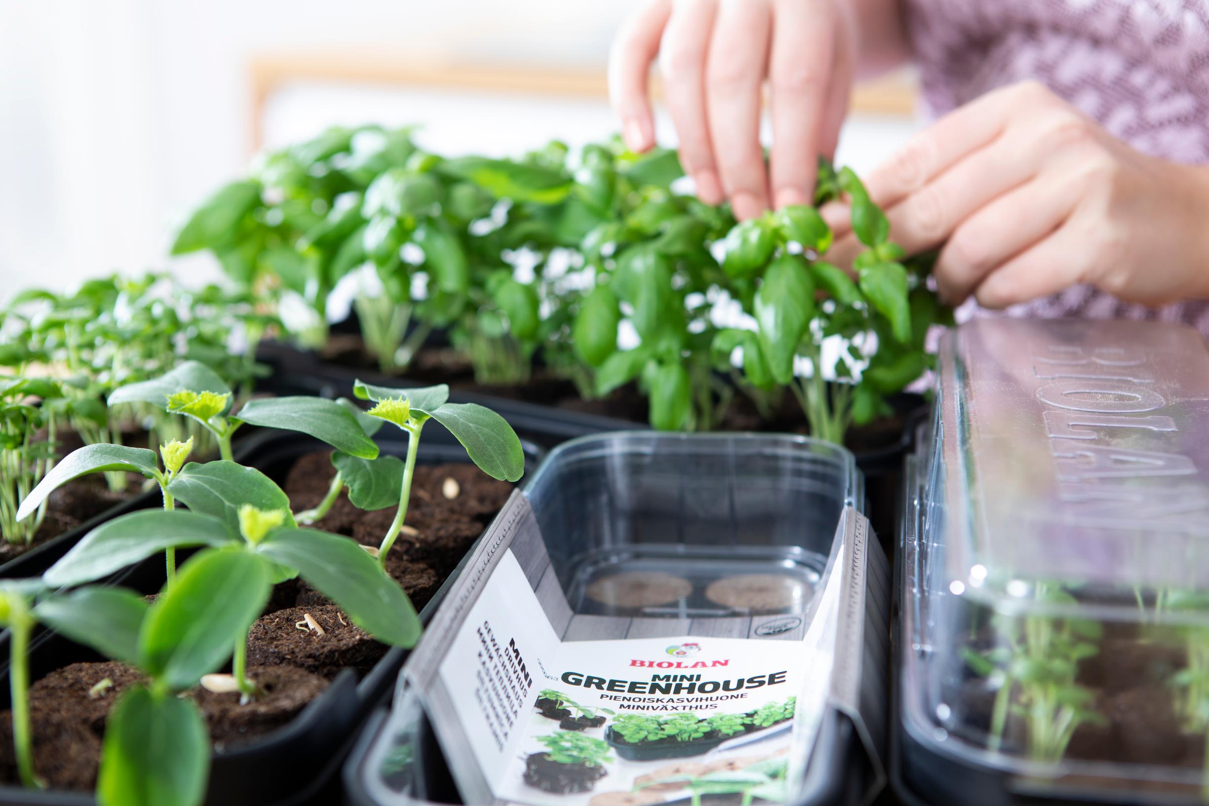 Biolan Pienoiskasvihuone ja Biolan Sammalnapit sopivat esimerkiksi yrttien, pelargonien ja pienten pistokkaiden juurruttamiseen. Kookas pistokas kannattaa tökätä kasvusammalella täytettyyn ruukkuun.
