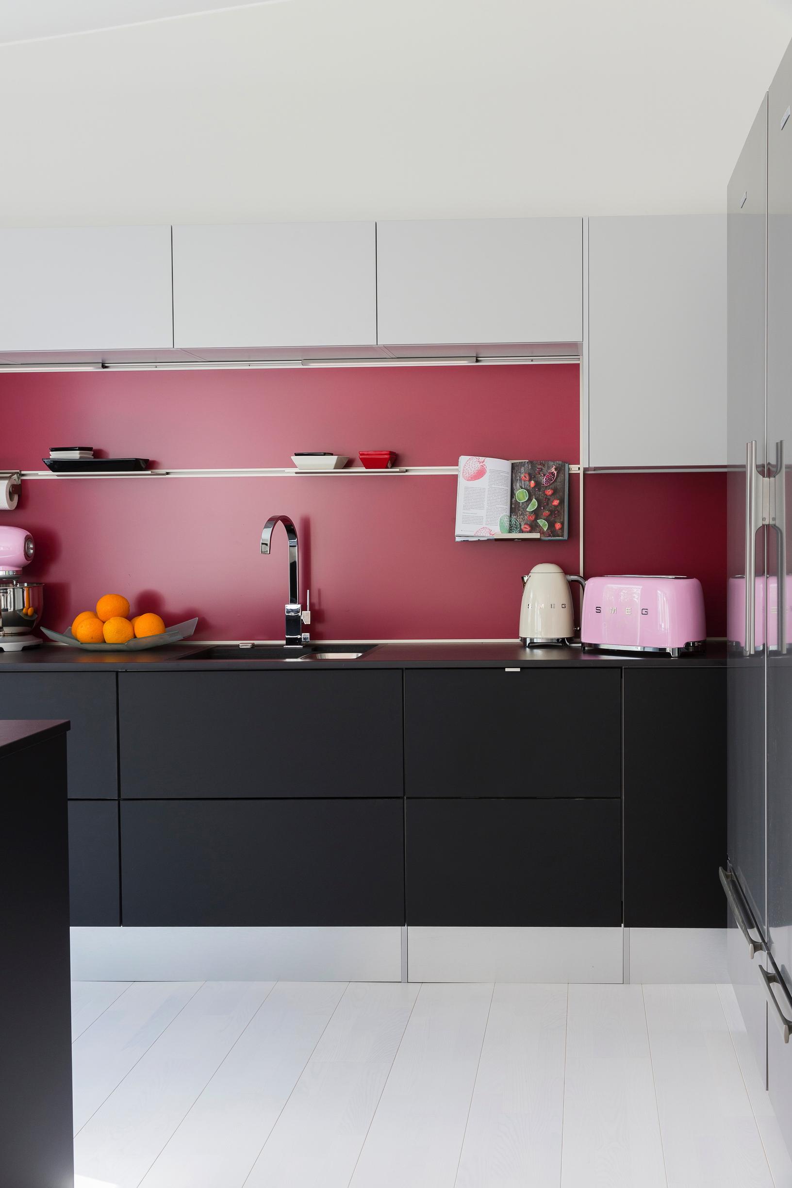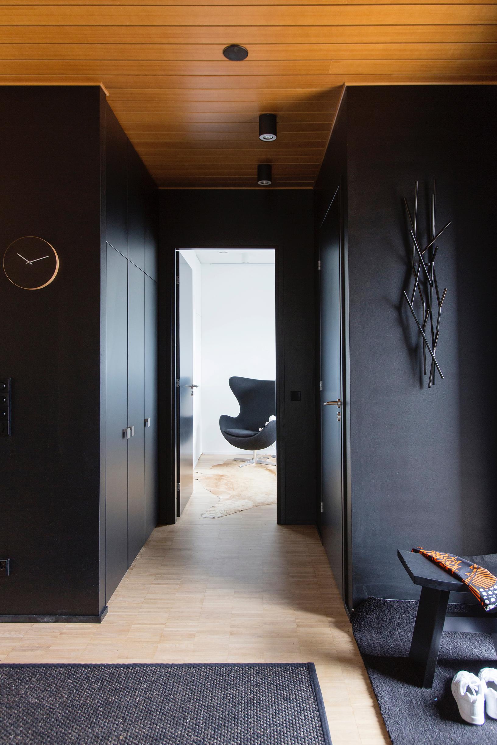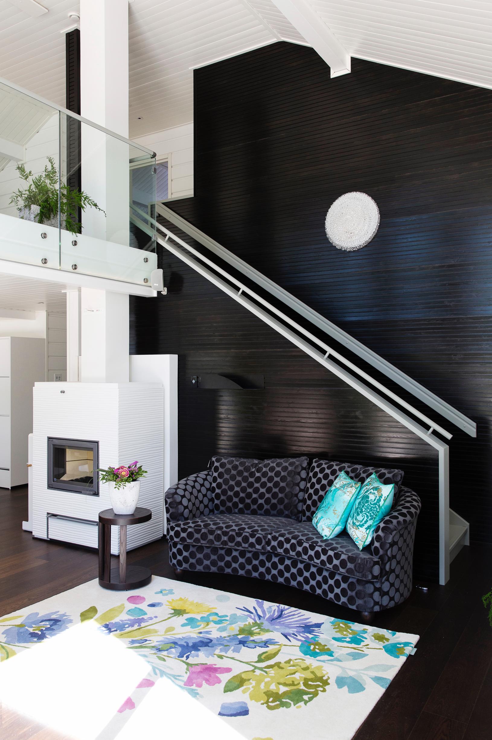 Vaaleassakin kodissa yksi seinä voi olla musta. Jos seinä on mielenkiintoisen muotoinen, musta tuo sen kaikkein tehokkaimmin esiin. Kiiltävään maaliin syntyvät heijastukset keventävät sisustuksen vaikutelmaa.