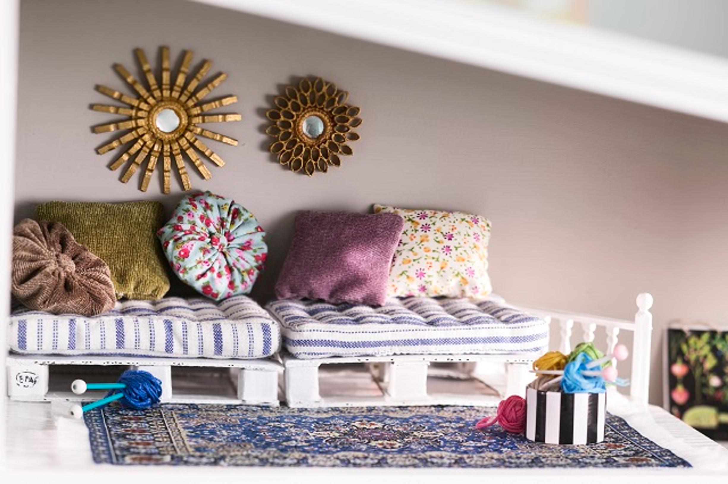 Vanha nukkekoti kunnostettiin maalilla, tapeteilla ja aaltopahvilla. Samalla sinne askarreltiin hauskat uudet nukkekodin kalusteet, kuten pikkuinen eurolava ja aurinkopeili.