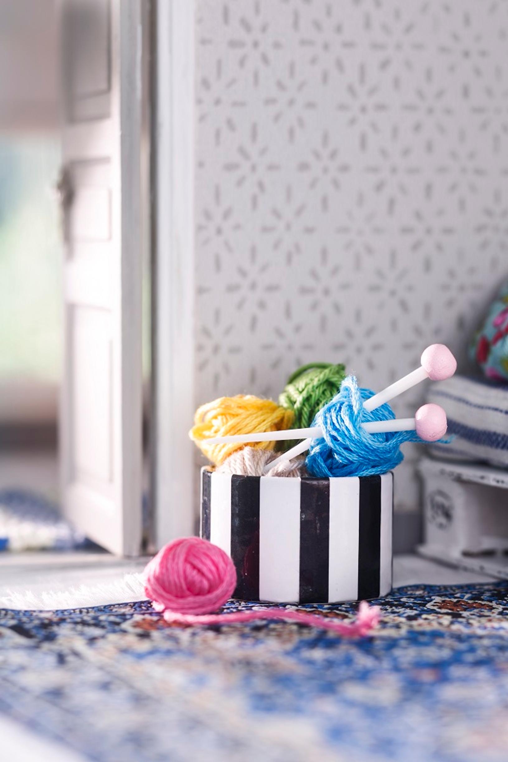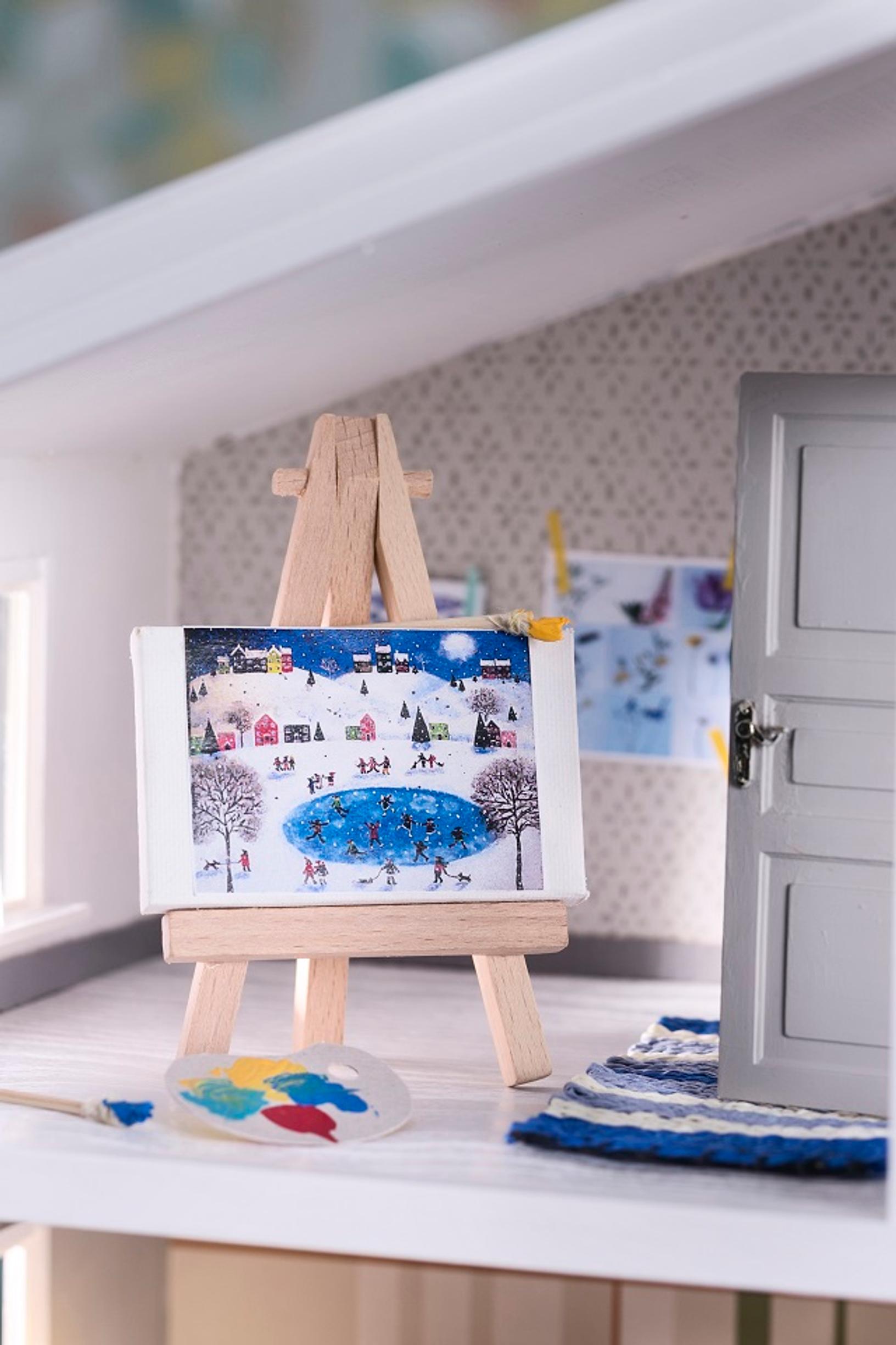 Omat työt on kiva tallentaa ja kopioida nukkekotiinkin. Väripaletti leikattiin pahvista ja pensselit tehtiin hammastikuista, joiden päihin on sidottu ompelulangalla pari milliä neulelankaa. Siveltimen pää kasteltiin maaliin. Pieni canvas-taulu ja teline on ostettu Flying Tiger Copenhagenista.