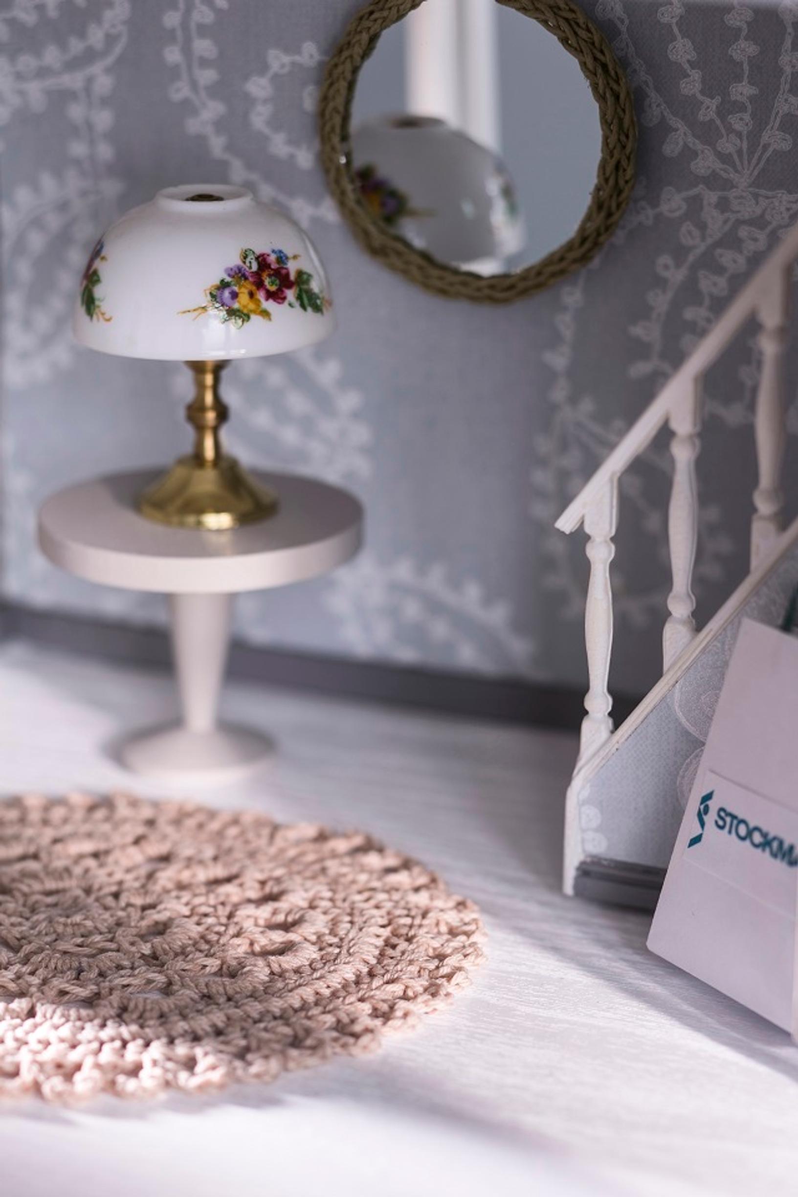 Peili on tehty puuterirasiasta. Kehykseksi letitettiin paperinarua. Ostoskassi taiteltiin ja siihen liimattiin netistä tulostettu Stockan logo. Itse virkattu pitsimatto kovetettiin juuttimaiseksi sokerivesiliemellä.