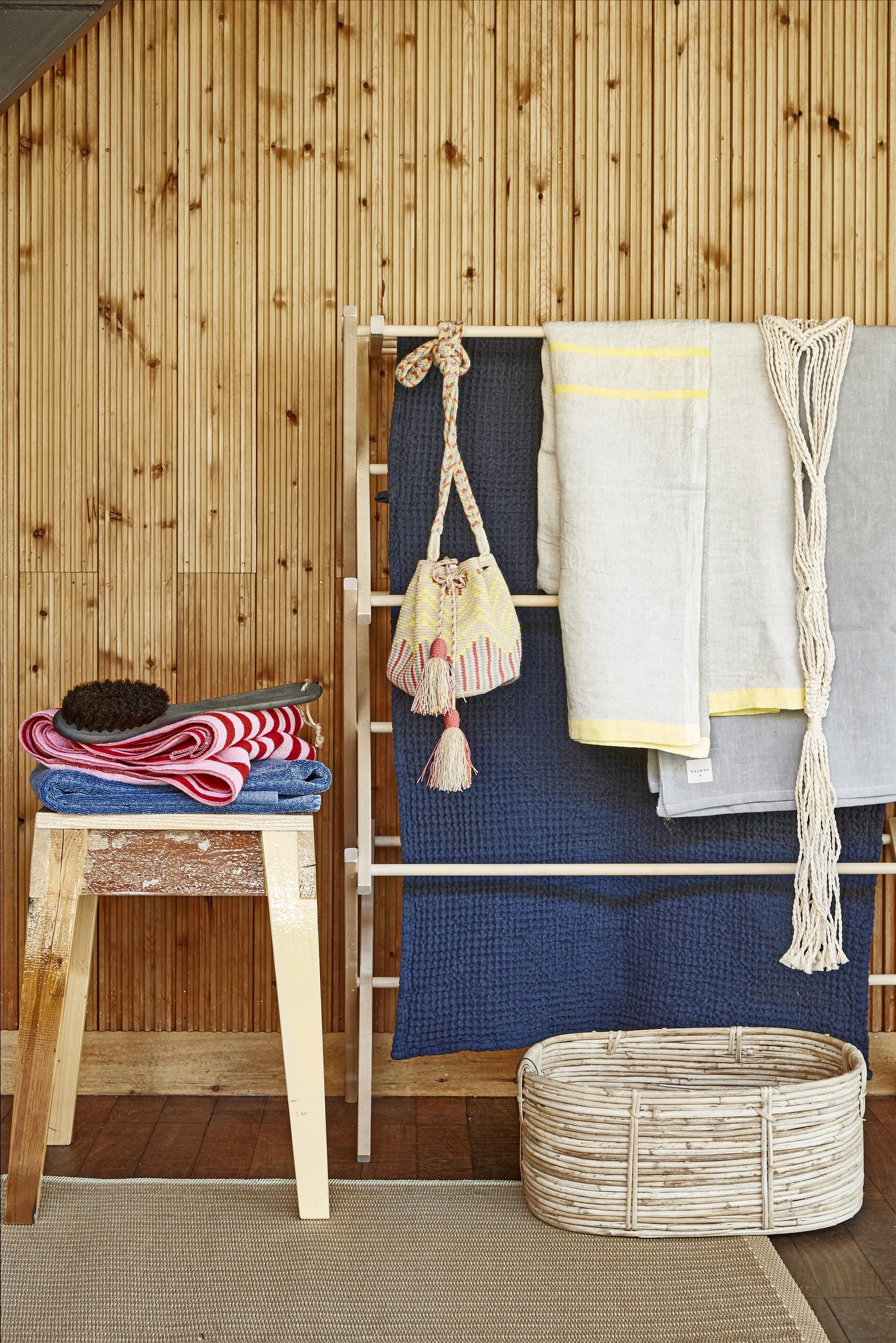 Kokoontaittuva kuivausteline (80 × 35 × 110 cm) 98 €, Cilla’s. Piet Hein Eekin jakkara on valmistettu kierrätyspuusta, 365 €, Artek. Matala rottinkikori sopii pienten pyyhkeiden säilyttämiseen, 42 €, Cilla’s. Kaksi raitaa -kylpypyyhe 39,50 €, Marimekko. Sininen Reno-kylpypyyhe 32,95 €, Finlayson. Tummansininen vohvelipyyhe 35,90 €, Granit. Pellavainen Usva-kylpypyyhe 62,90 € ja Sokevan pesuharja 23,30 €, Lapuan kankurit. Ailigasin siniharmaa Hempeä-hamppupyyhe (90 × 150 cm) 69 €, Kaarna Living. Guanabanan käsin kudottu pussukka 98 €, Tikau. Mican makramee-amppeli 8,90 €, Stockmann. Hayn paperimatto (60 × 90 cm) 80 €, Formverk.