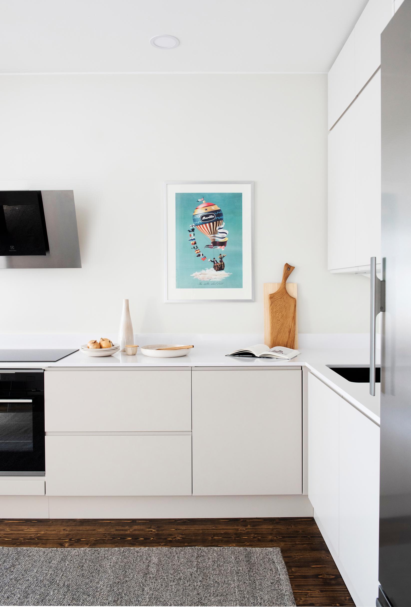 – Keittiön on hyvä olla asunnon muuhun tyyliin sopiva, mutta liian varovainen ei tarvitse olla. Esimerkiksi pikkukeittiöön voi hyvin sopia räväkämmät värit. Nyt käytetään paljon myös tummempia sävyjä, kuten sinistä ja vihreää.