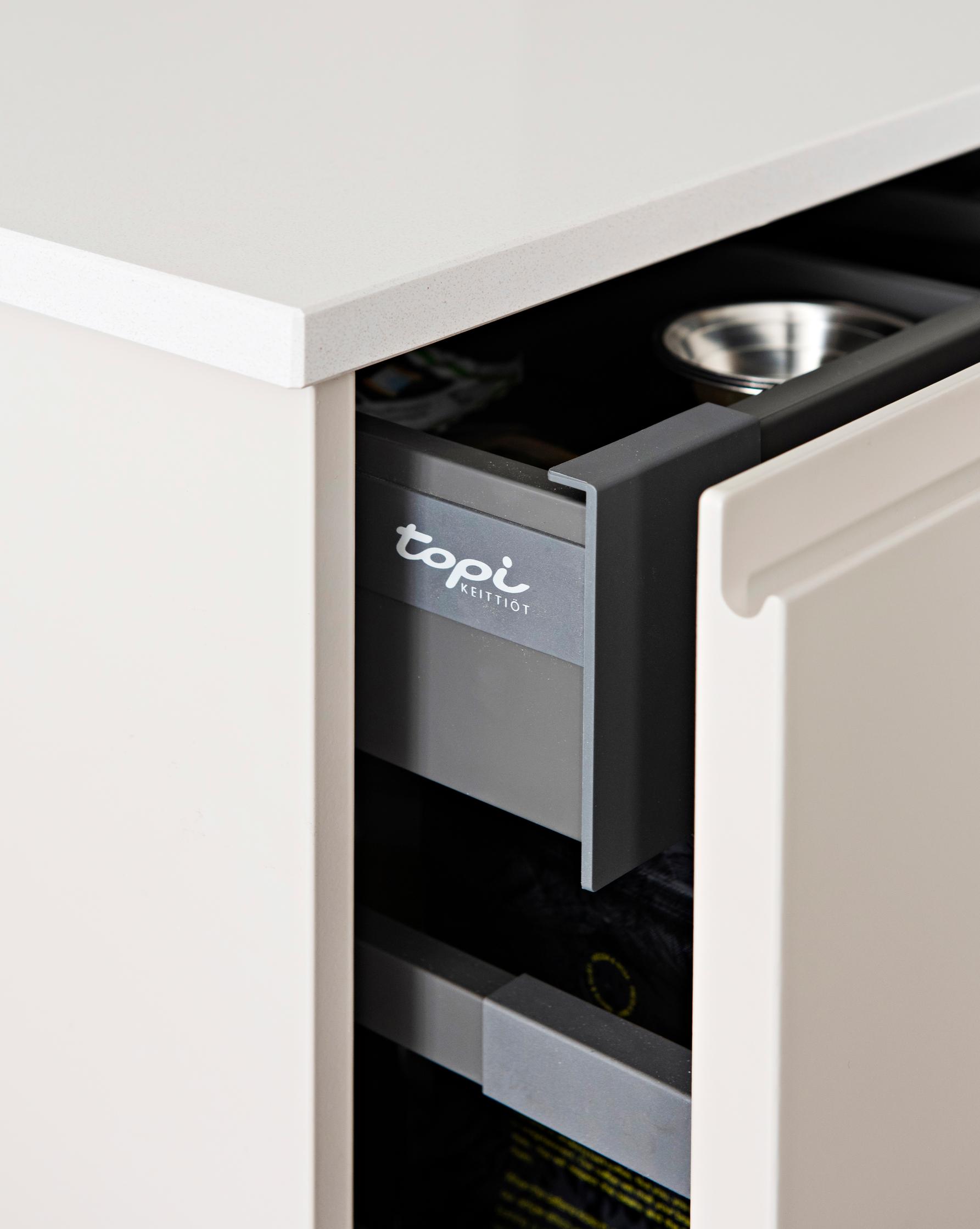 – Aluksi on tärkeää miettiä, mihin keittiötä käytetään ja kuka sitä käyttää: jos yleensä vain yksi kokkaa, tarvitaan työskentelytilaa vähemmän, mutta jos perheellä on tapana kokata yhdessä tai esimerkiksi ystävien kanssa, tarvitaan reilusti työskentelytilaa ja myös kylmäsäilytystilaa, kertoo Topi-Keittiöiden keittiösuunnittelija Siru Vainio Helsingin Topi-myymälästä.