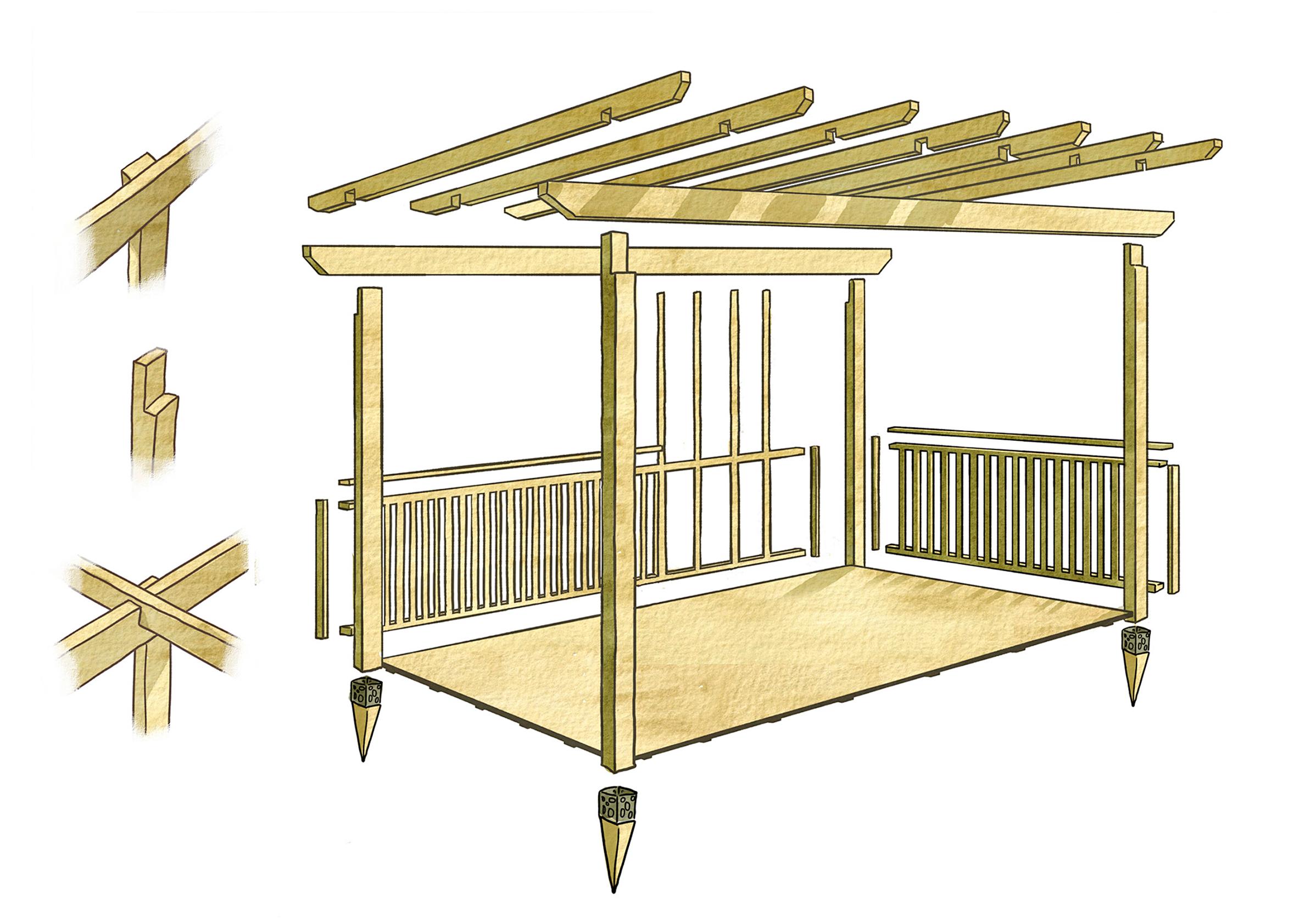 Pergola on viileä levähdyspaikka ja mökkipihan silmänilo. Pergolan rakentaminen ei yleensä vaadi rakennuslupaa, mutta asia kannattaa varmistaa oman mökkikunnan rakennustarkastajalta.