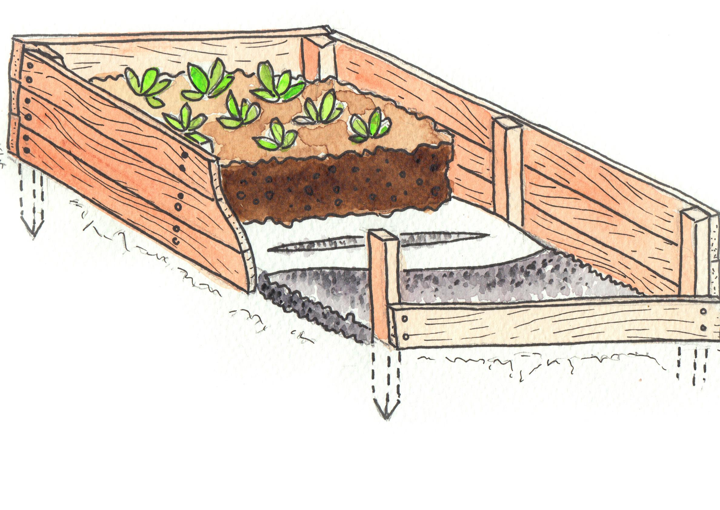 Lapioi lavan salaojitusta varten pohjalle noin 15 cm kerros salaojasoraa. Voit jättää soraan kulkuaukkoja maan pieneliöille, jotta ne pääsevät nousemaan lavan multaan.