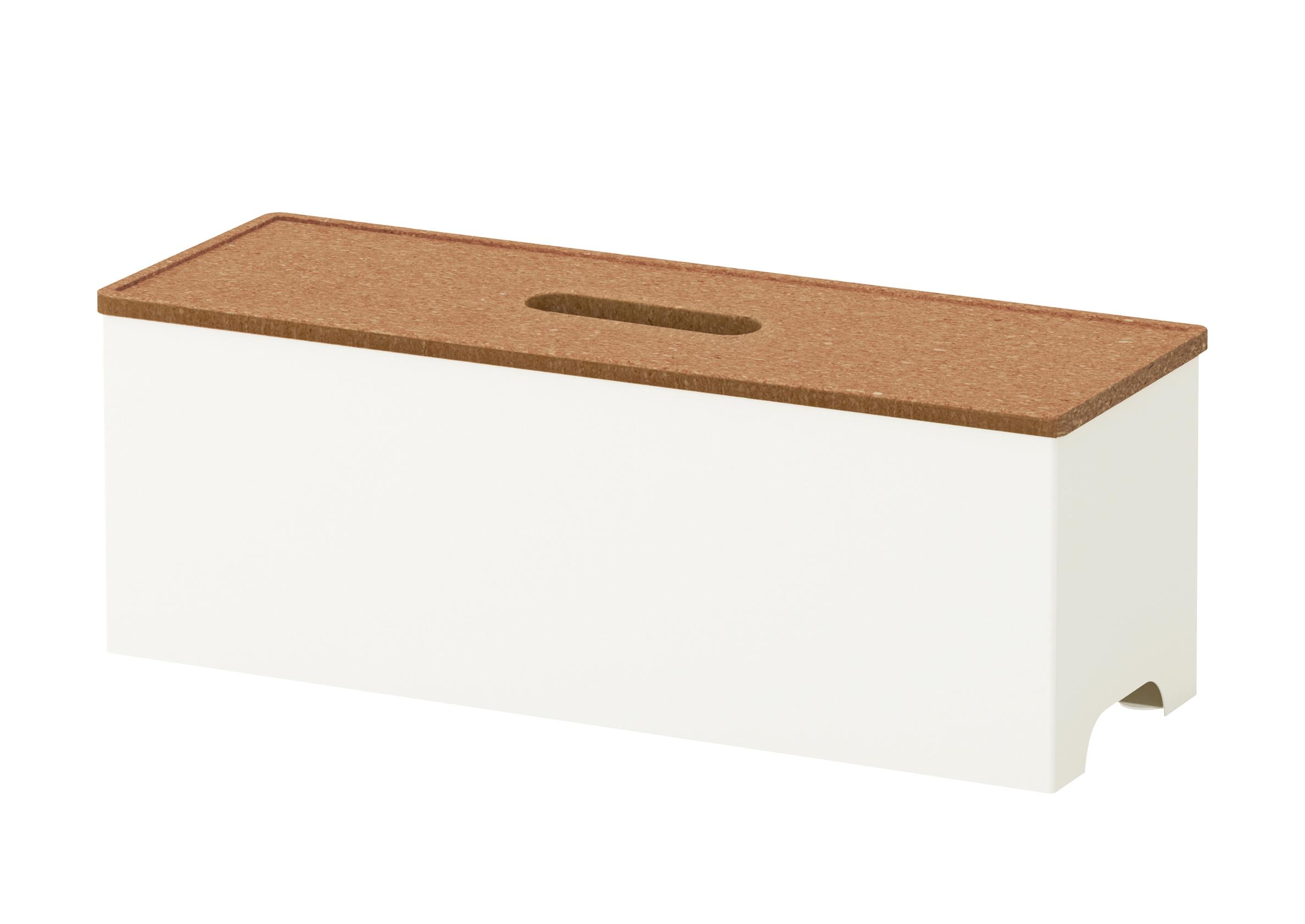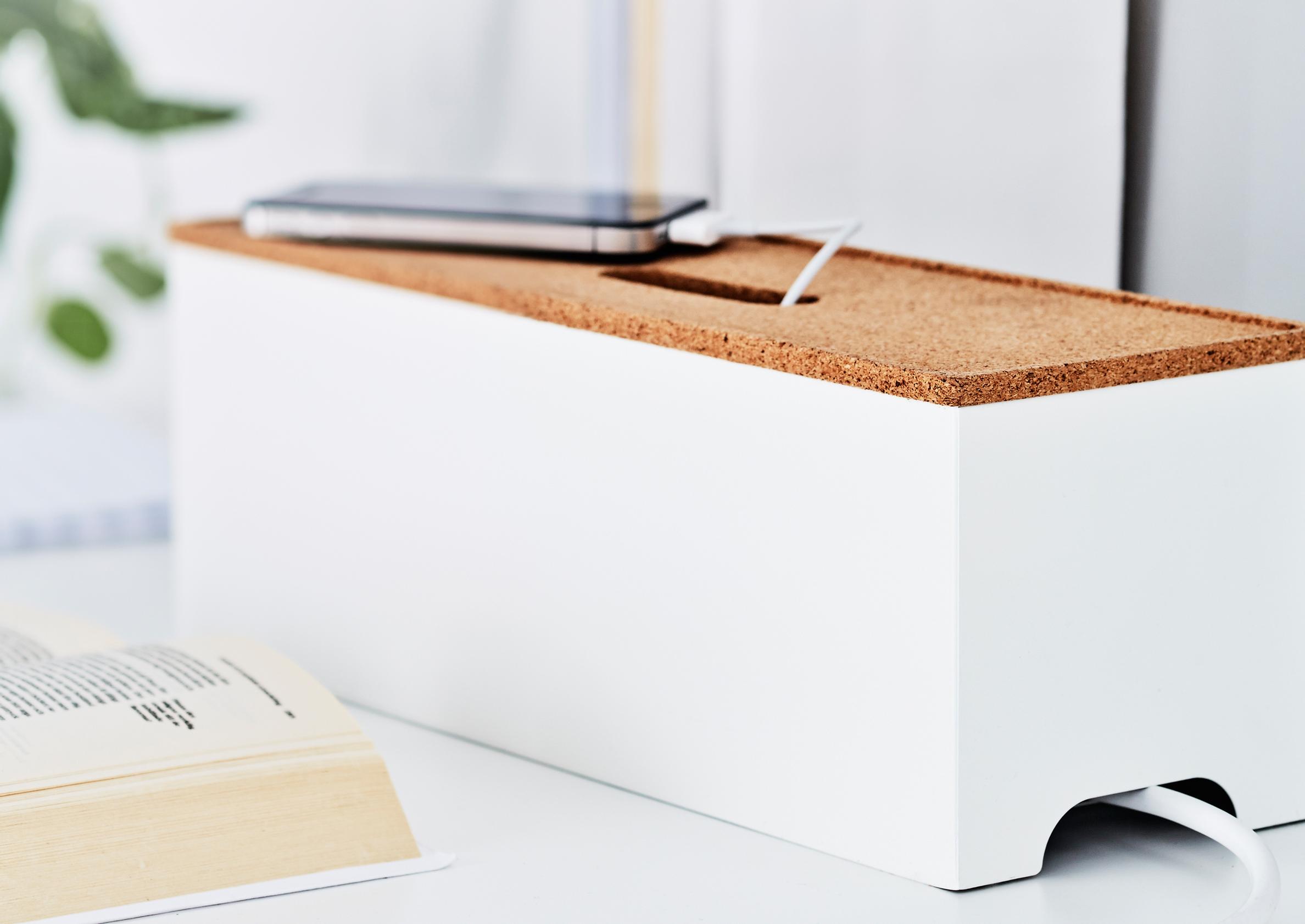 Kvissle-johtolaatikon kannessa ja päädyissä on reiät johdoille. Laatikko on maalattua terästä ja kansi korkkia, Ikea.