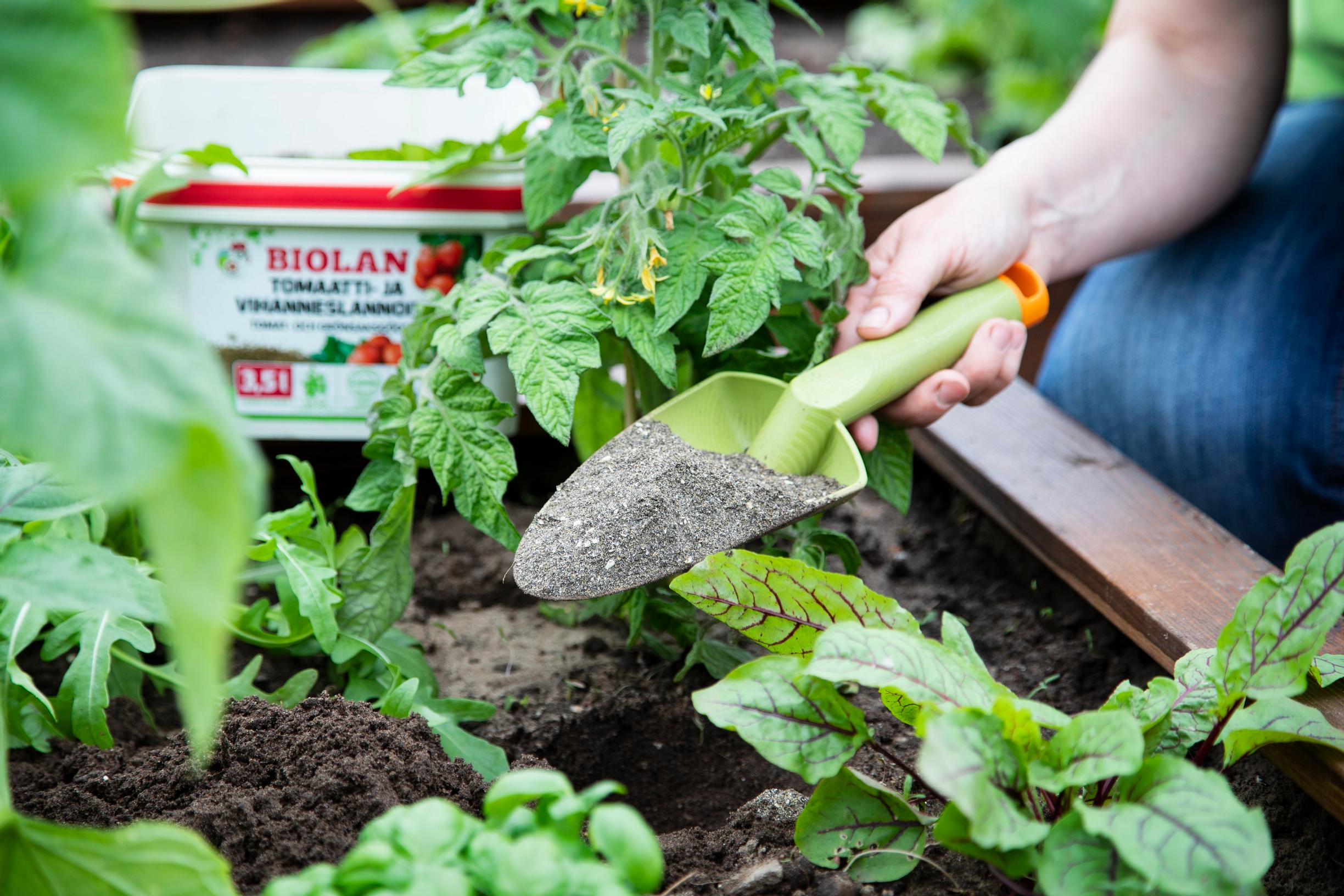 Biolan Kasvusäkissä varastolannoitus on valmiina. Lannoitteen määrä riittää koko kasvukaudeksi kolmelle taimelle (esim. tomaatti, kurkku, paprika).