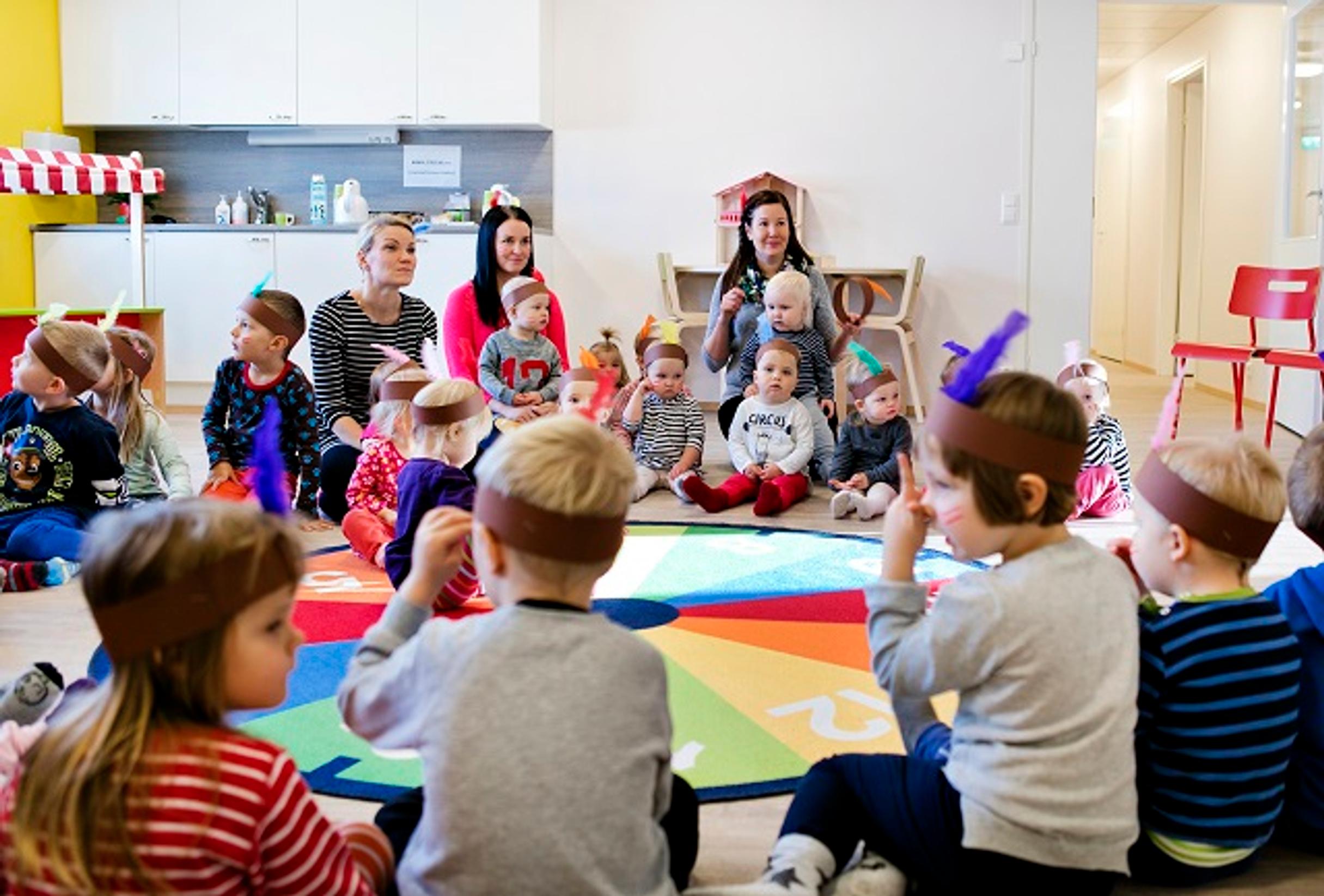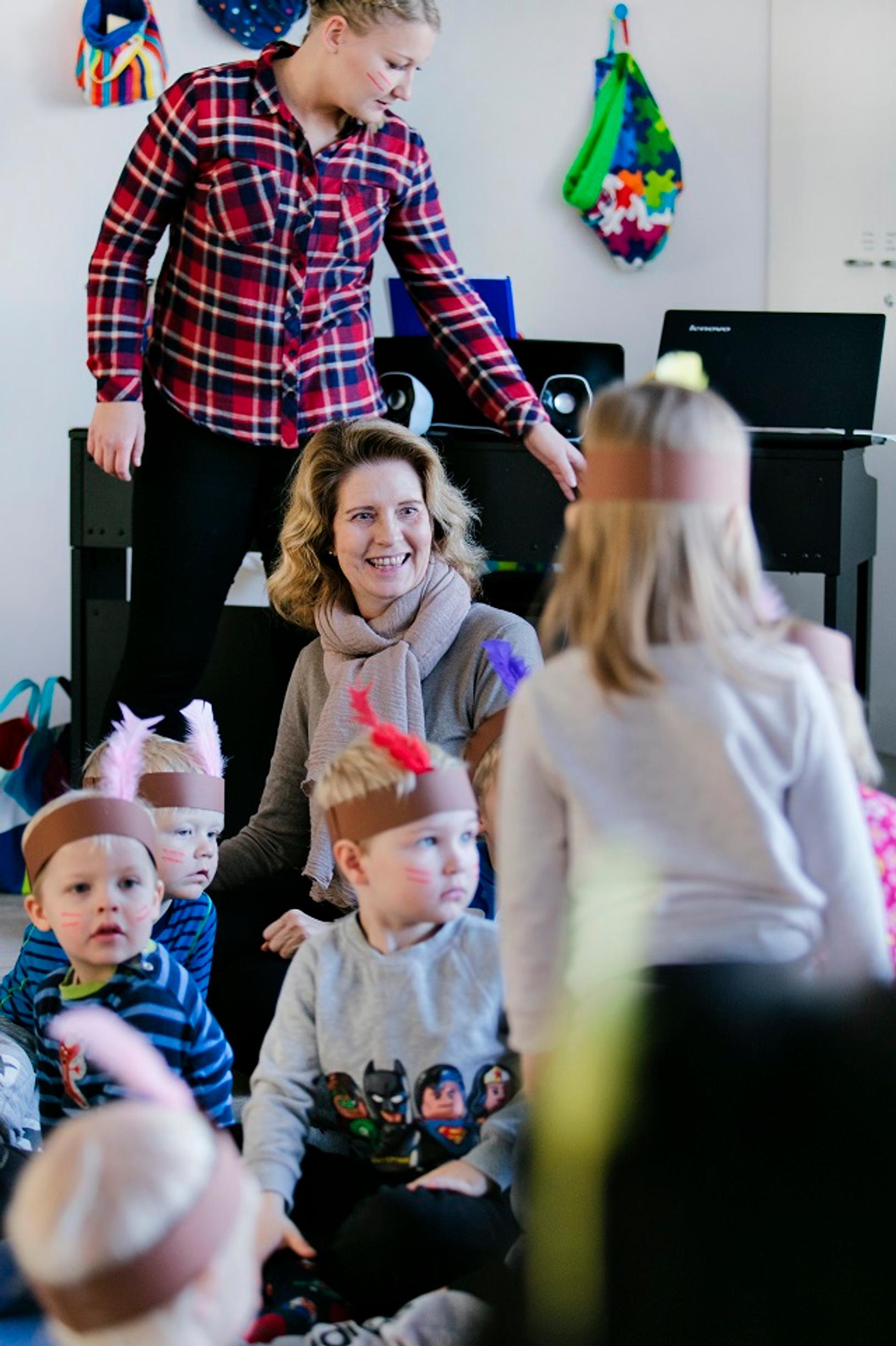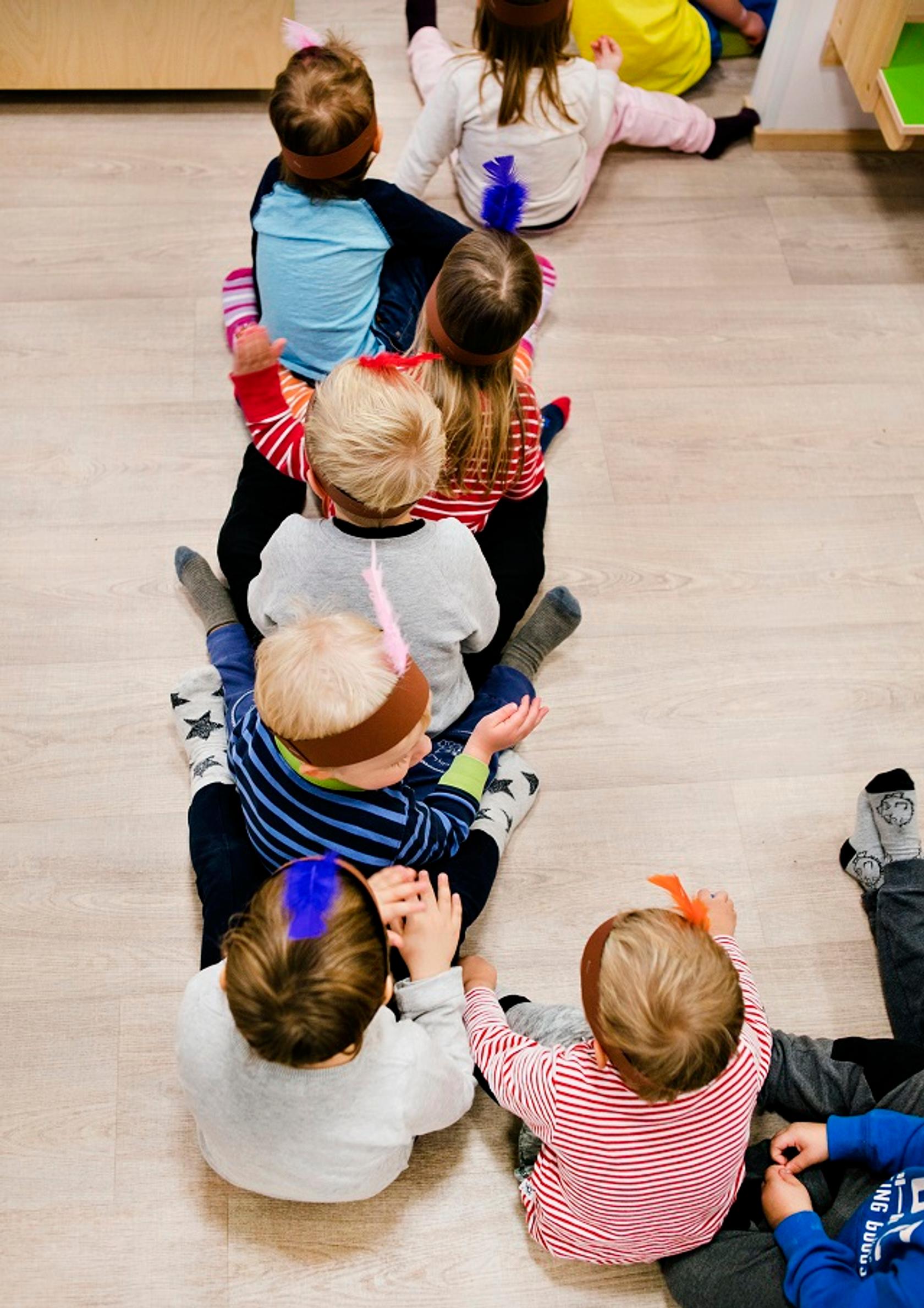 Keskiviikosta on vakiintunut yhteinen laulupäivä. Tänään vuorossa on intiaanilauluja, ja päiväkodin valoisassa salissa lapset saavat päähänsä sulkakoristeet.
