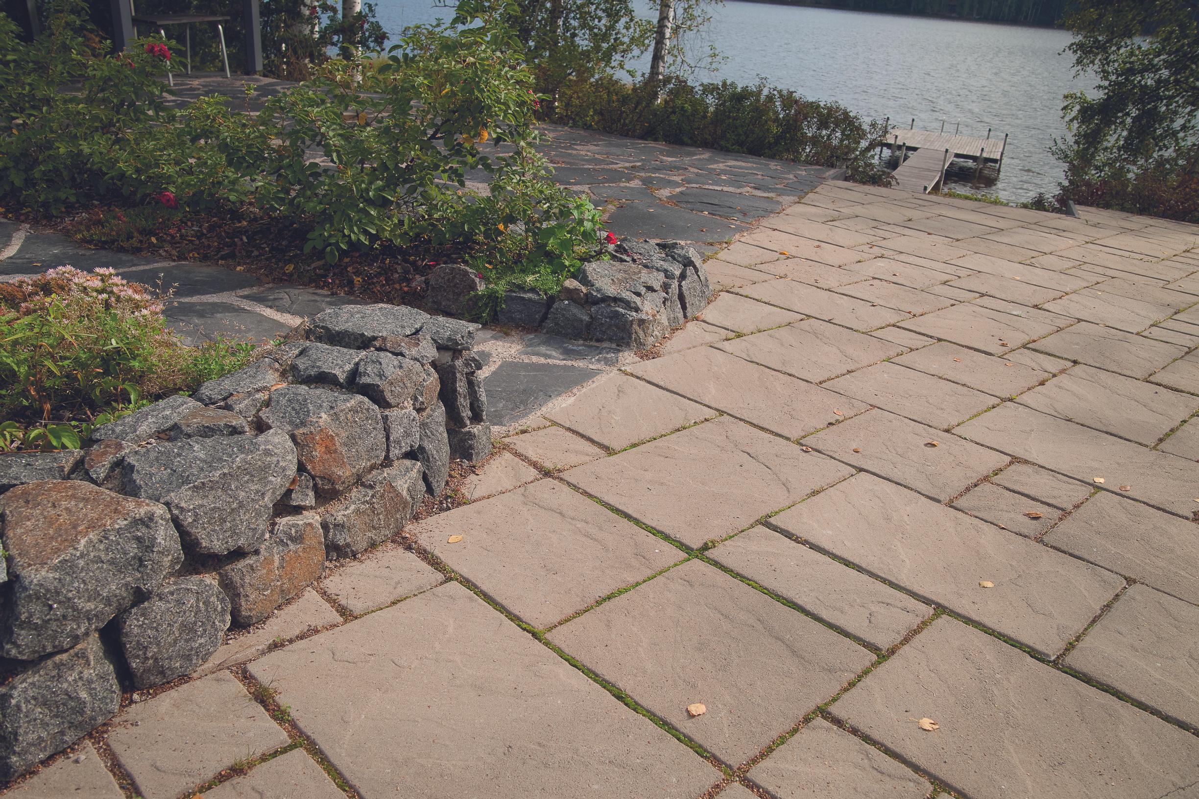 Käsistään kätevä voi naputella terassit itse, ja betonikiveykset kovalle pohjalle onnistuu monelta.