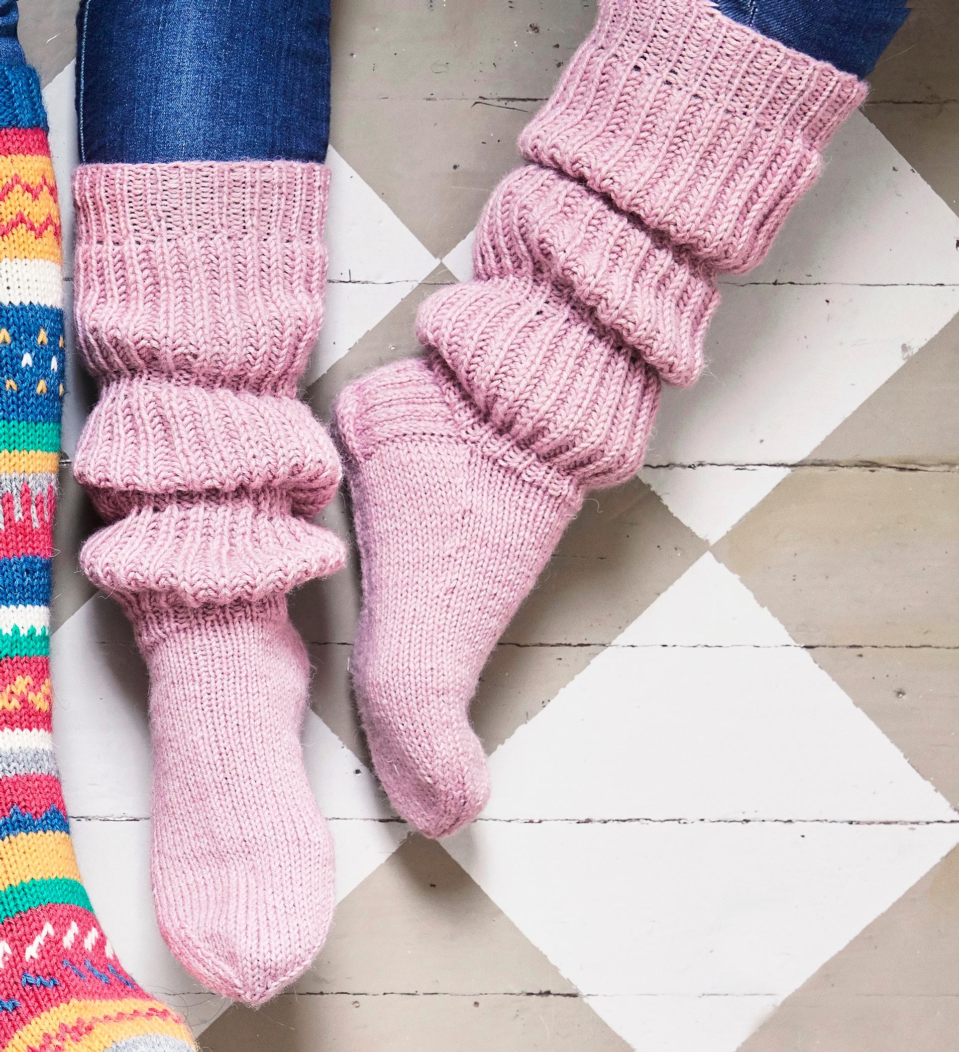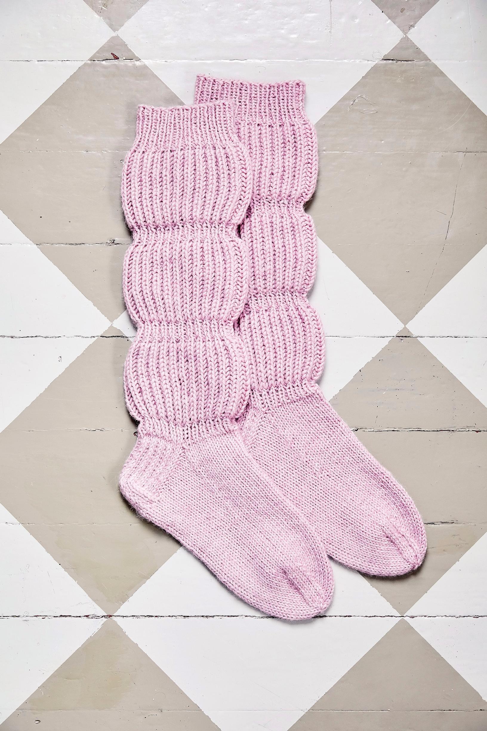 Ruttusukkien varsi neulotaan patentti- ja joustinneuleella, jolloin se rypyttyy tanssijan säärystimien tyyliin. Pitkät sukat pitävät kintut taatusti lämpiminä.