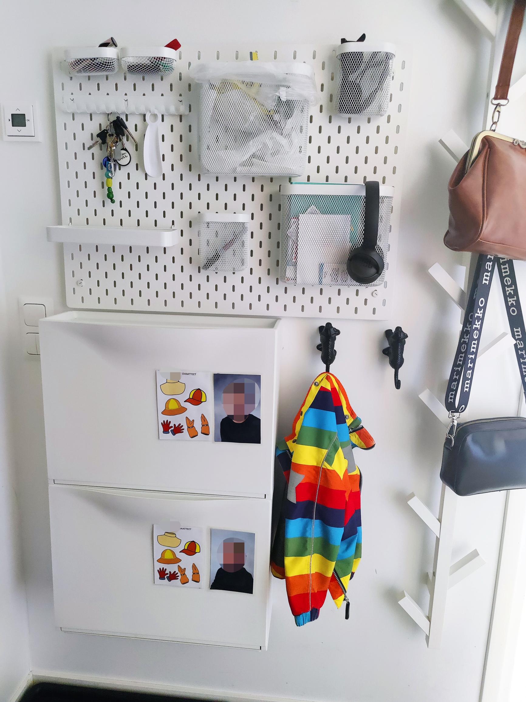 Sain pari vuotta sitten haastatella kahden lapsen äitiä Johanna Alasuutaria, joka on organisoinut perheensä eteisen ihailtavan huolellisesti. Moni Johannan eteisoivallus jäi mieleeni, ja joitain niistä olen jo soveltanut omaan eteiseemme – kuten tilpehööritaulun, johon saa kätevästi roikkumaan esimerkiksi avaimet, kyniä, heijastimet, sateenvarjon ja kauppakassin.