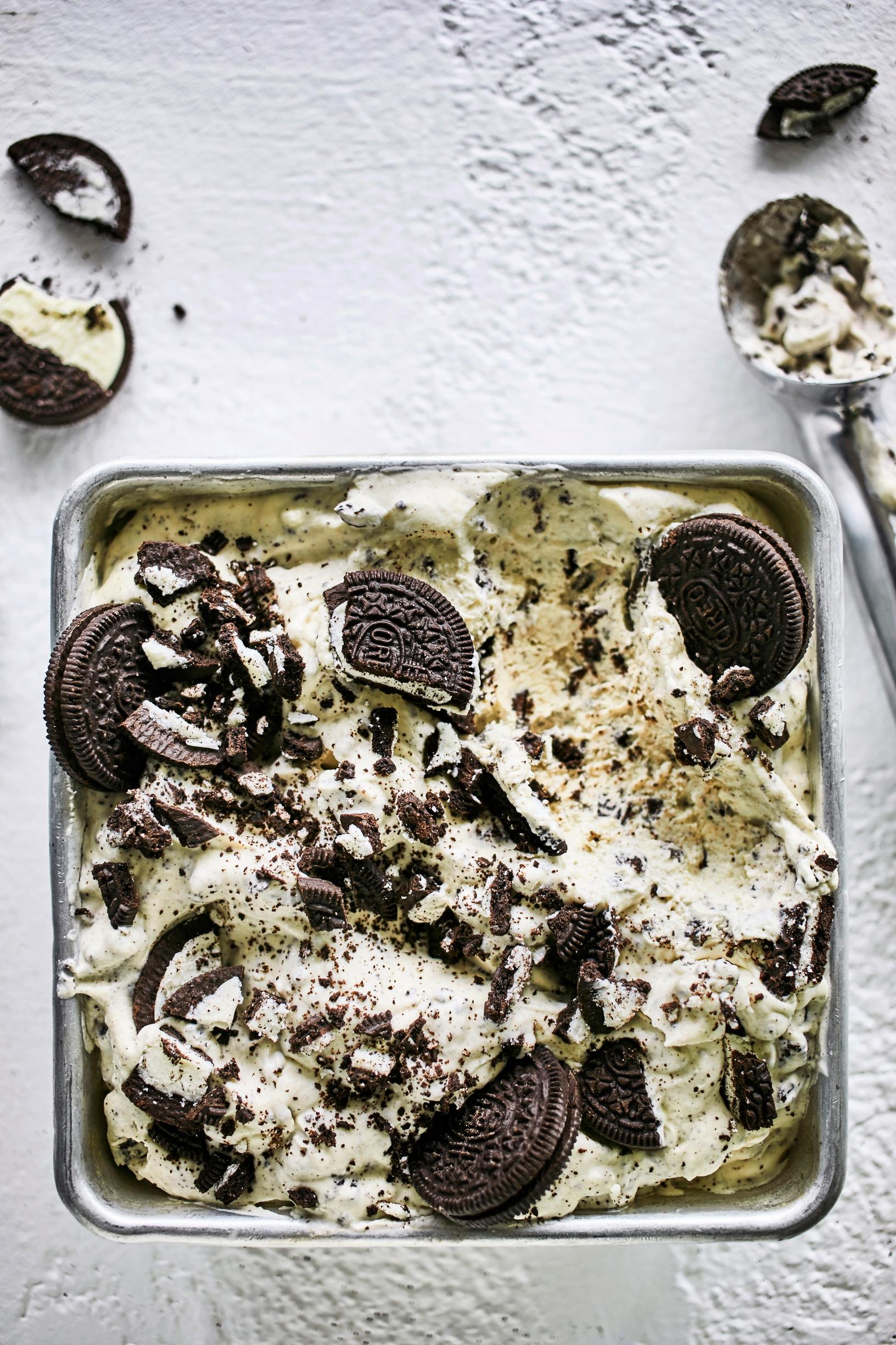 Oreo-jäätelö vaatii tekijältään todella vähän toimia. Sekoita kermavaahto, kondensoitu maito, vaniljasokeri ja keksimurska, kaada vuokaan ja työnnä pakastimeen. Et tarvitse jäätelökonetta, eikä sinun tarvitse edes sekoittaa jäätelöä.