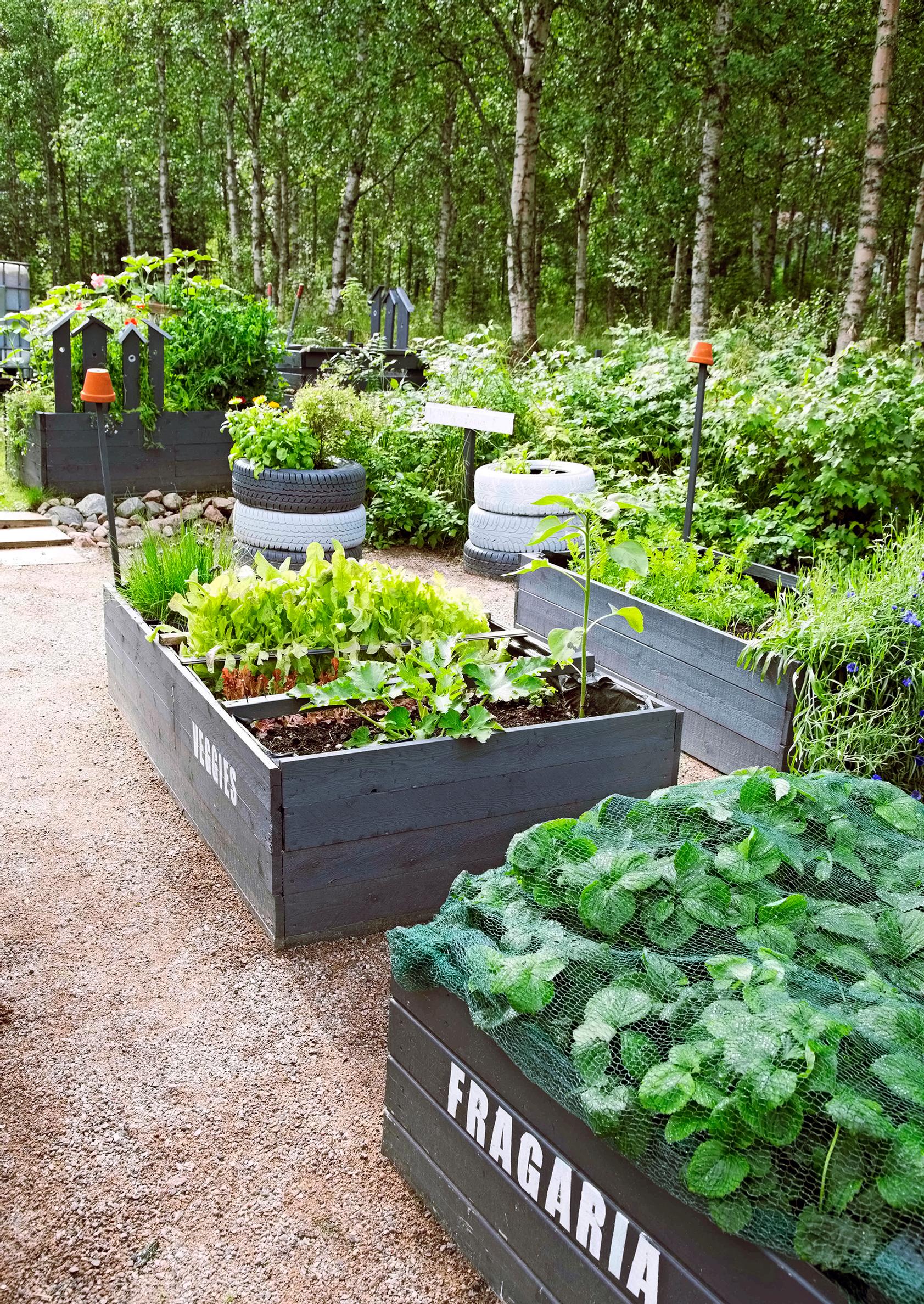 Marin mielestä tuntui helpoimmalta perustaa vihannestarha itse rakennettuihin viljelylaatikoihin perinteisen kasvimaan sijasta. Koska laatikot pystytetään maan pinnan yläpuolelle, Mari välttyi raskailta lapiotöiltä. Tontin pohjamaa on vanhaa metsää, jota kaivaessa tulee nopeasti savea ja kiviä vastaan.