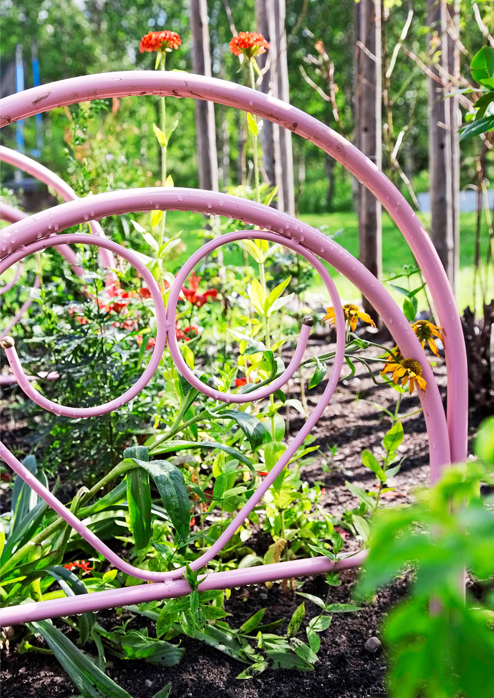 Tämä on uusi puutarha, jonka vanhimmat osat ovat neljän vuoden takaa. Kauneus on minulle kaikkein tärkeintä, mutta kasvatan myös perheellemme syötävää omalla kasvimaalla. Haluan näyttää lapsilleni, mistä ruoka tulee. Heistä on hauska napsia mansikoita suoraan suuhun tai kerätä salaattia leivän päälle. Puutarha ja kasvit ovat minun oma juttuni, mutta mieheni auttaa suurimpien suunnitelmien toteuttamisessa. Olemme nikkaroineet yhdessä esimerkiksi viljelylaareja.