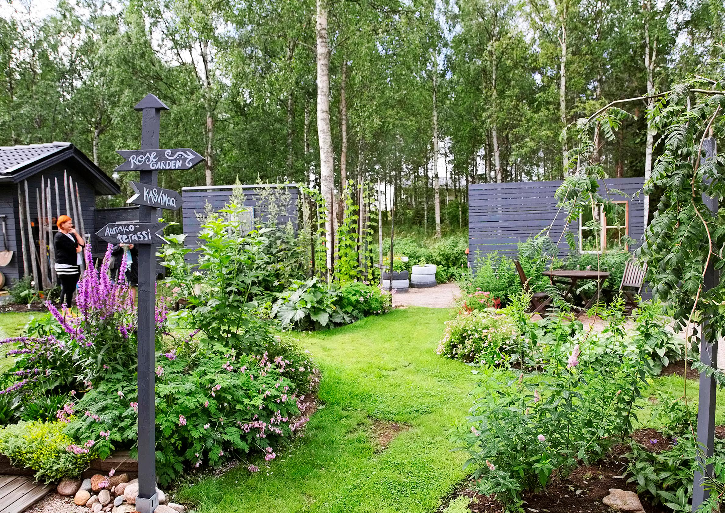 Kyllä oli. Olen ammatiltani hortonomi ja tein karkean suunnitelman jo silloin, kun taloa vasta rakennettiin. Aika hyvin sitä on noudatettu. Pieni etupiha on hyvin yksinkertainen, jopa karu. Halusin, että värikäs ja kukkaisa puutarha odottaa kuin yllätyksenä takapihalla. Kasvimaa on tummaksi maalatuissa lavoissa.