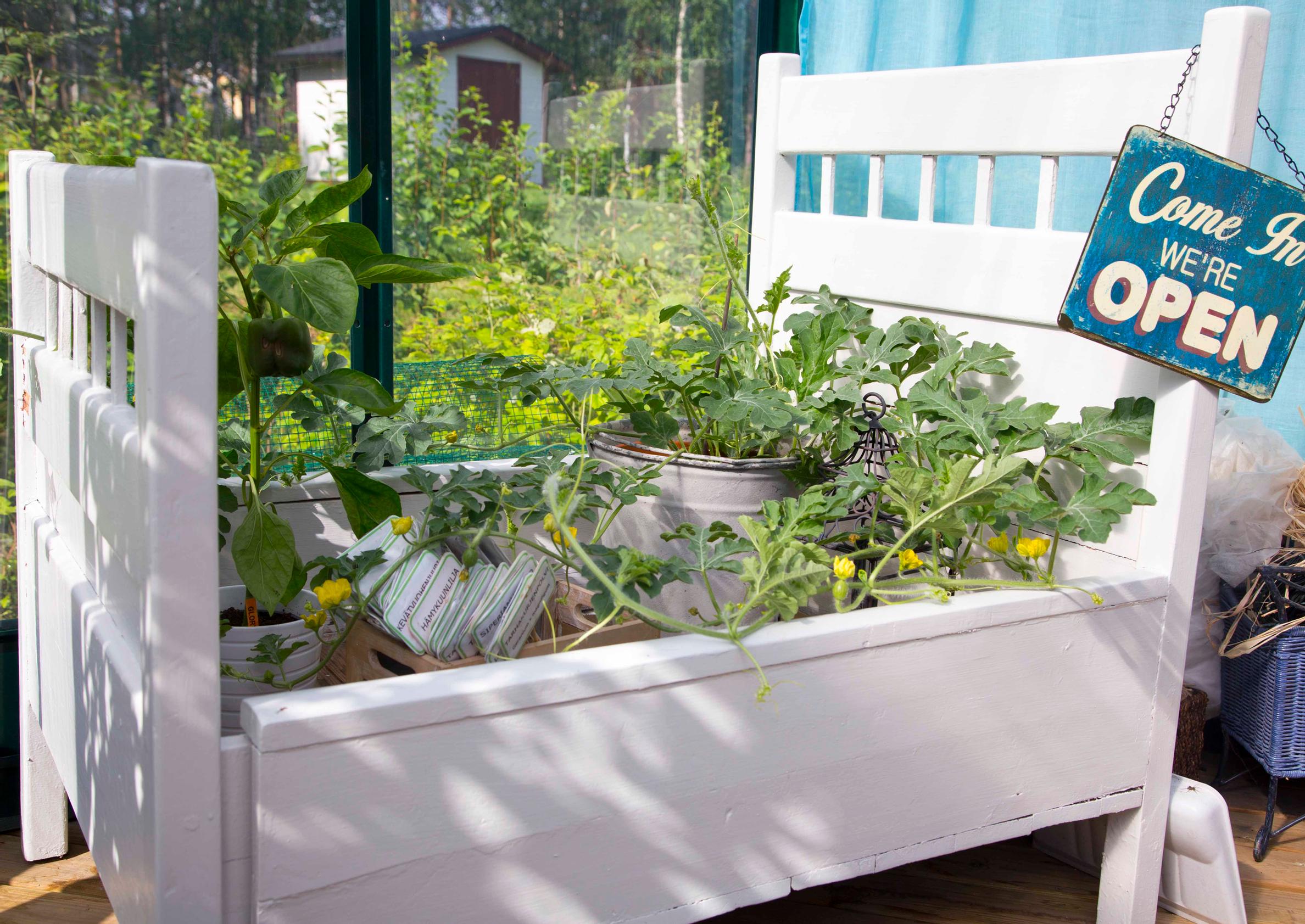 - Etsi sopivia tavaroita rompetorien ja kierrätyskeskusten lisäksi myös ystävien nurkista. Moni hankkiutuu mieluusti eroon itselleen tarpeettomasta tavarasta. Mari on saanut terassin pöytälevyksi sopivan vanhan oven ystävältä punaviinipulloa vastaan.