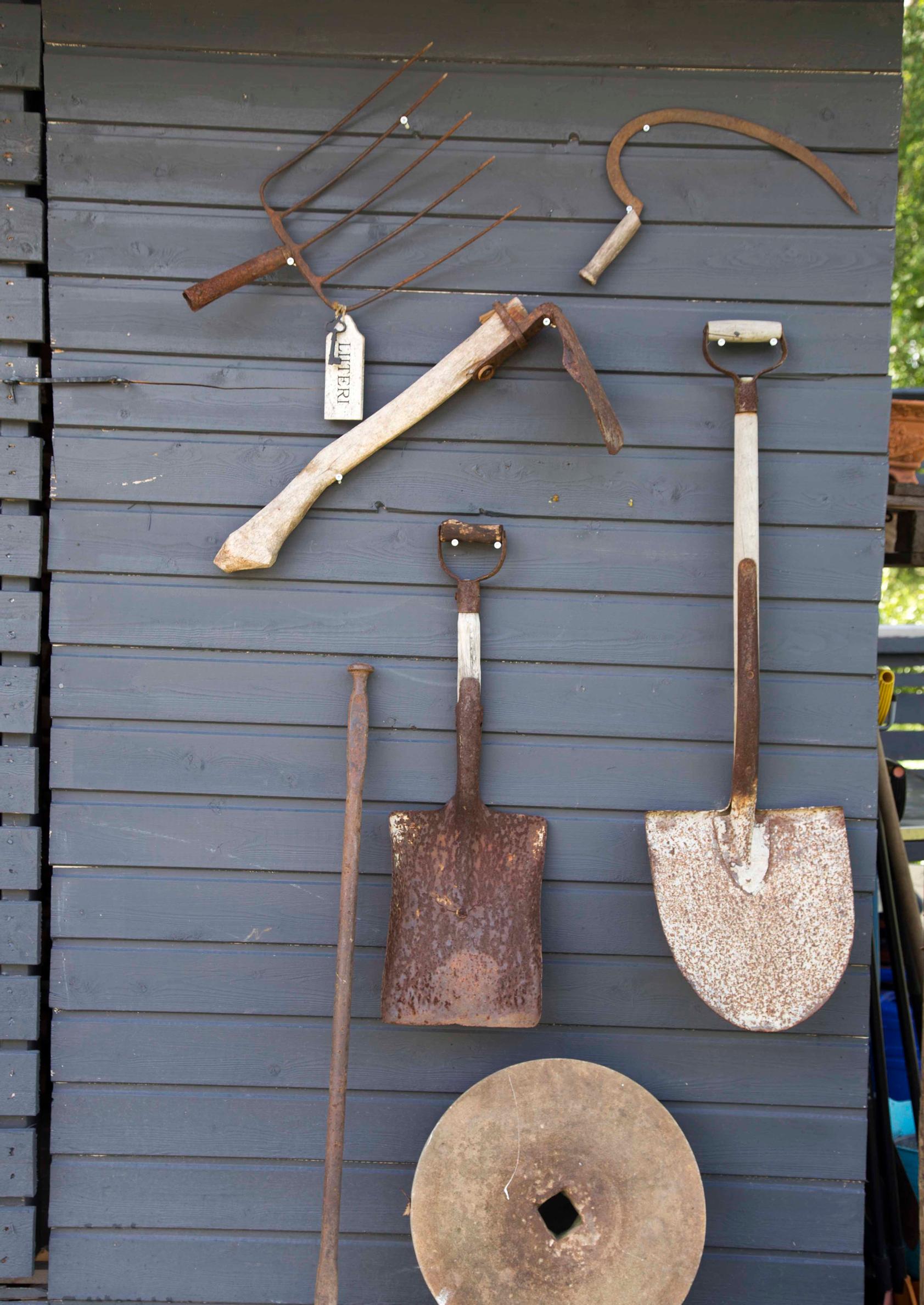 Osa vanhoista esineistä on peräisin Marin lapsuudenkodista ja ystäviltä. Pihavajan seinää koristavat isän kotipaikasta Pohjanmaalta löytyneet, kauniisti ruostuneet työkalut. Terassin suuren pöydän pöytälevynä on ystävän ikivanha ovi.