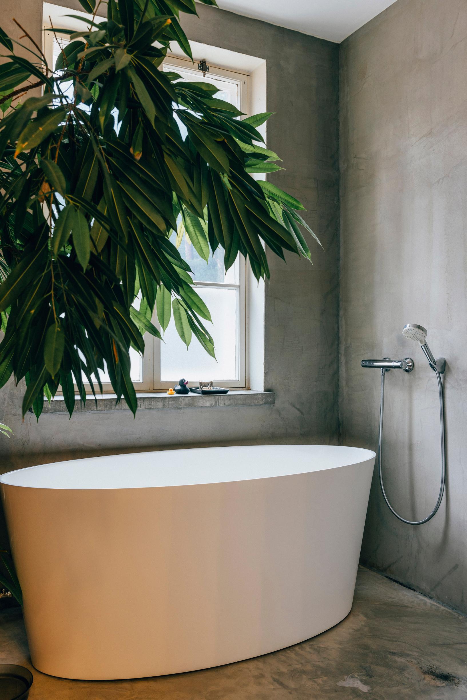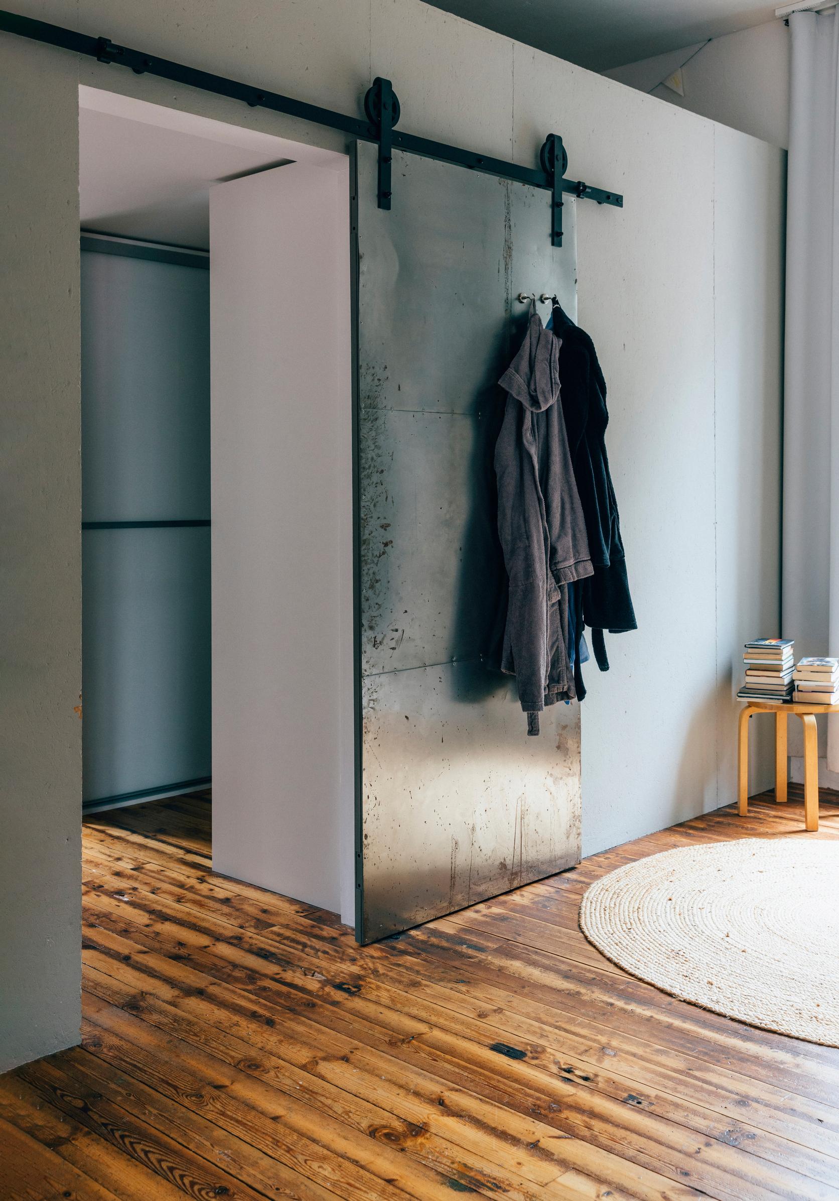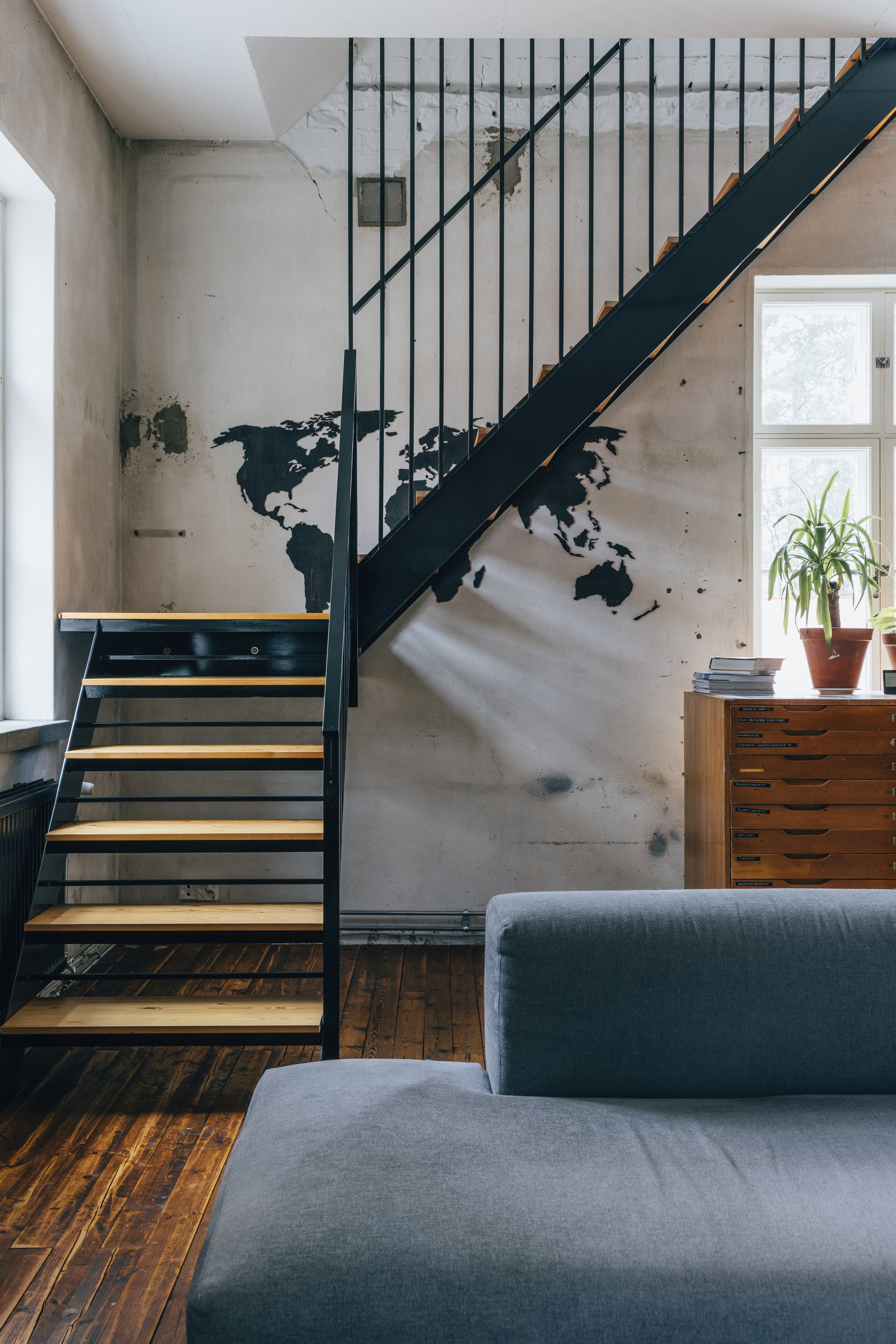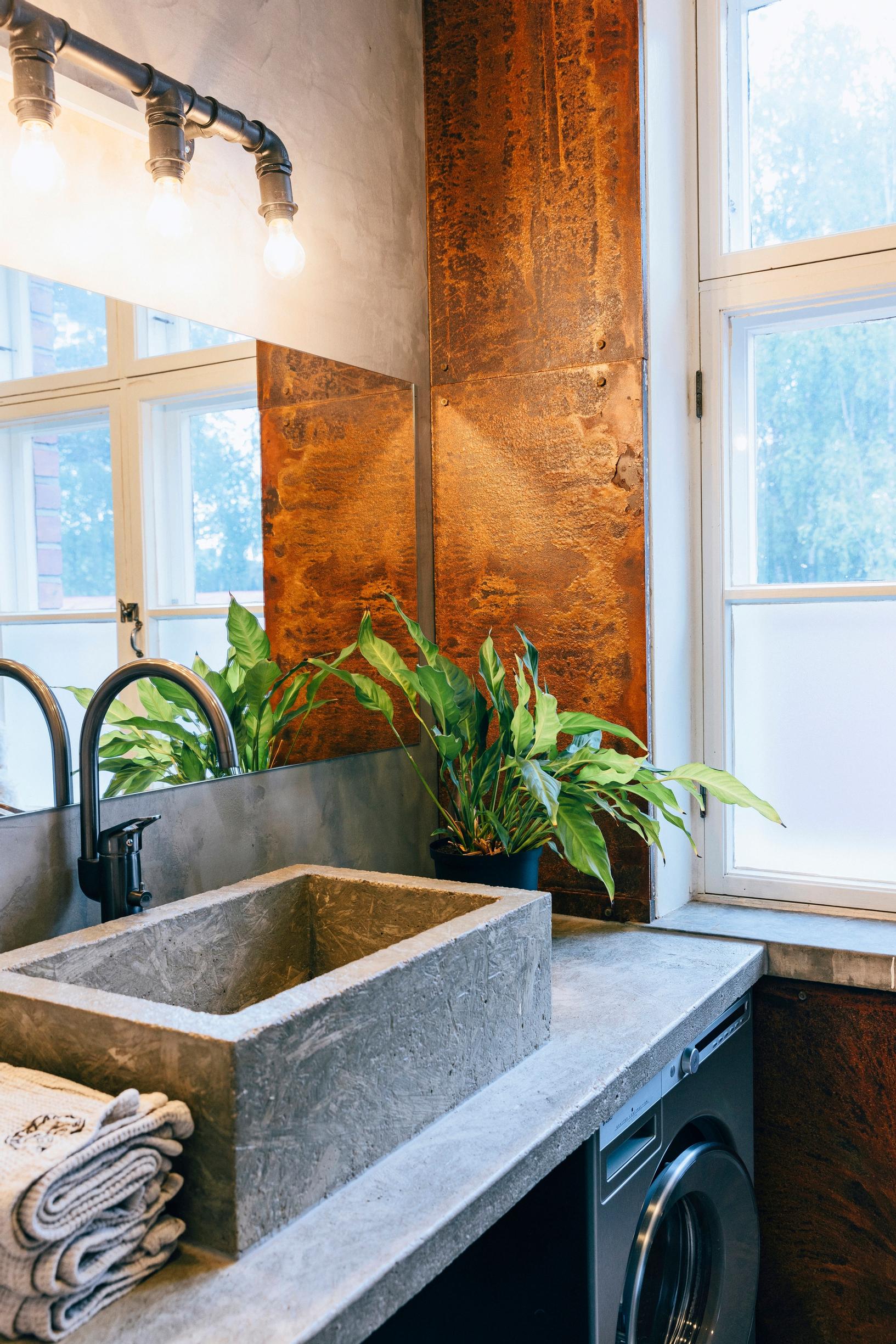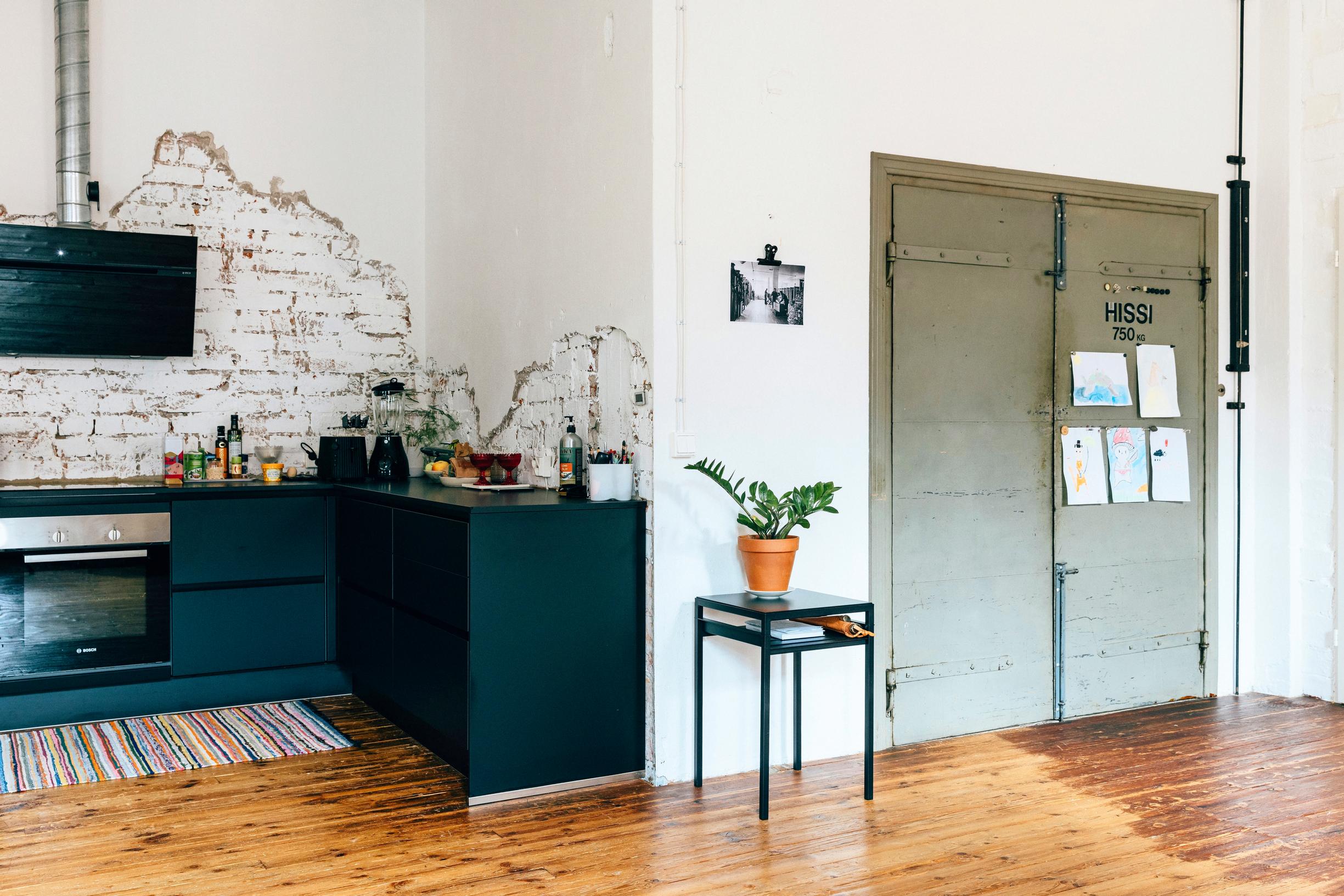 Alakerran kohdalla oli ennen tuotevarasto. Sen aikaiset lattian ja seinien pienet jäljet on jätetty näkyviin. Industrial-tyyliä tai persoonallisuutta ei tarvitse suurennuslasilla etsiä.
