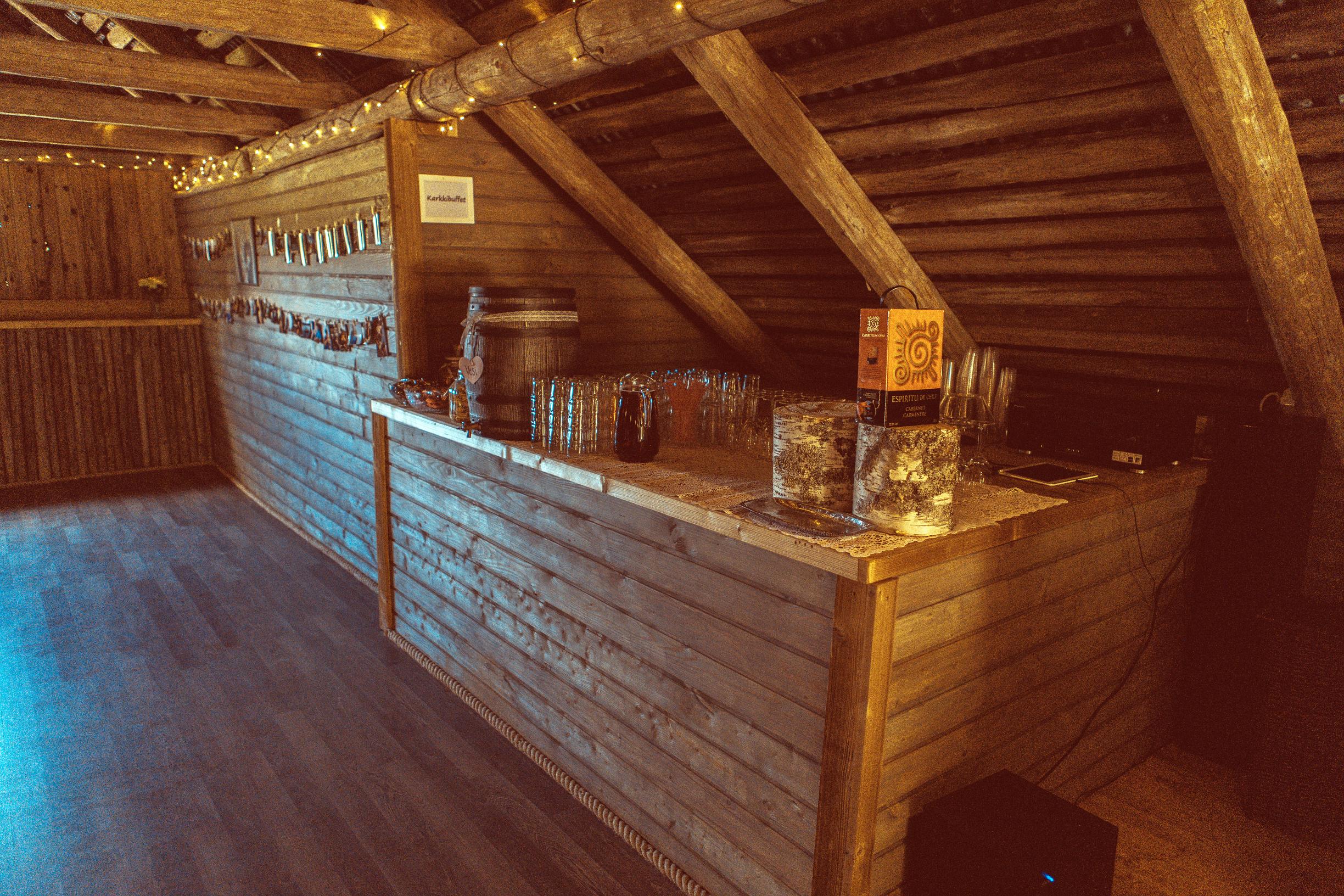 Pysyimme onneksi aikataulussa, ja keväällä laajensimme projektia alakertaan: navetan entinen karjakeittiö muuttui pieneksi keittiötilaksi ja toinen entinen huussi salakapakaksi. Salakapakka oli muuten häissä yllättävän suosittu!