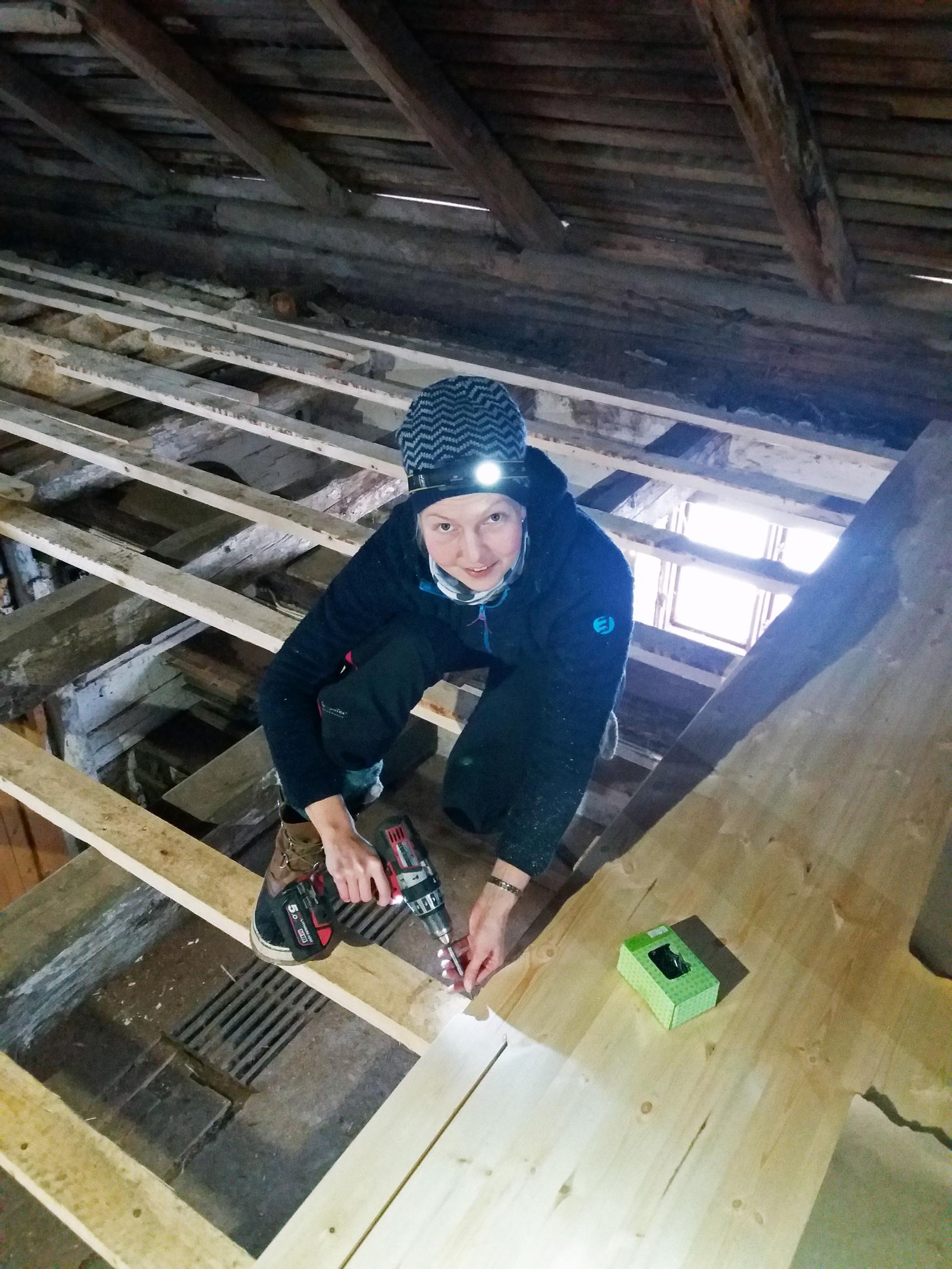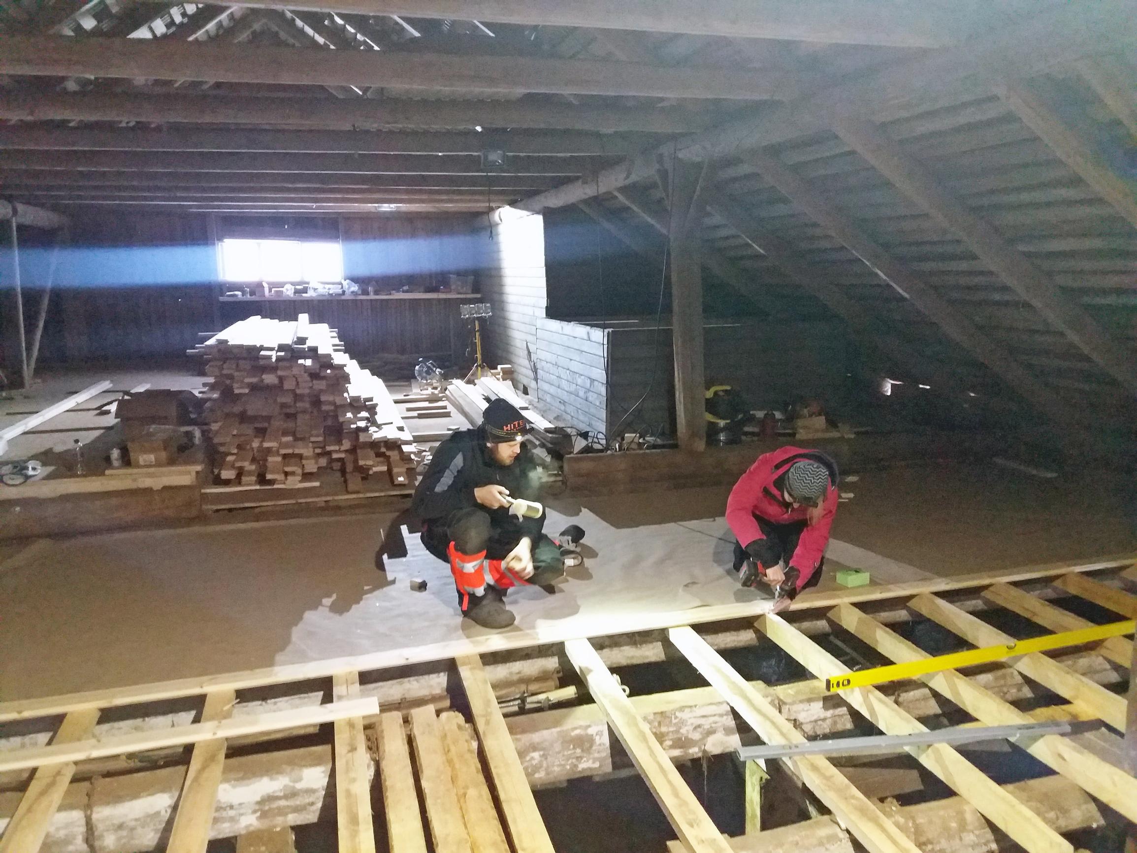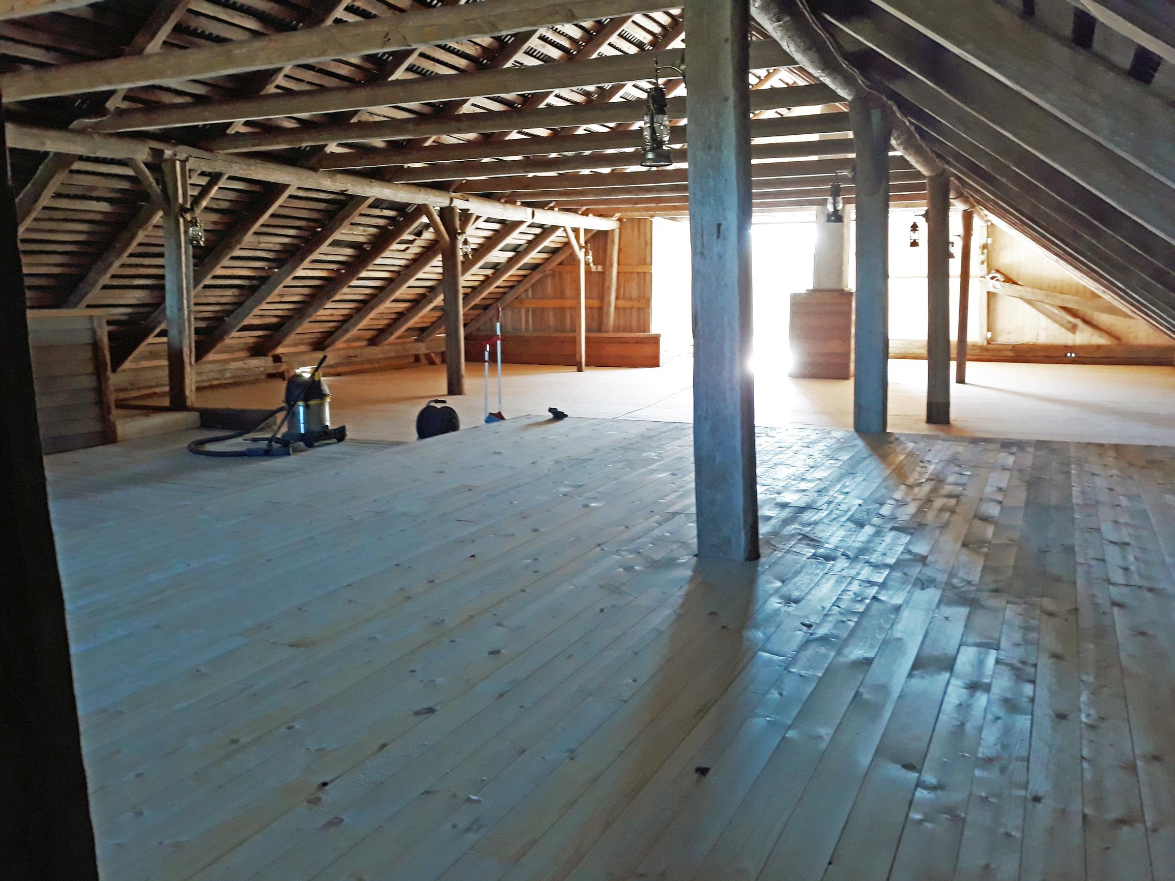 Osasimme varautua siihen, että työrupeama on iso. Tiesimme myös kokemuksesta, että yllätyksiä tulee väistämättä, kuten pökkiintyneitä tukipuita. Työ tuntui inhottavalta ainoastaan silloin, kun imuroimme kattohirsiä. Se vei 20 tuntia ja motivaatio oli kyllä hukassa.