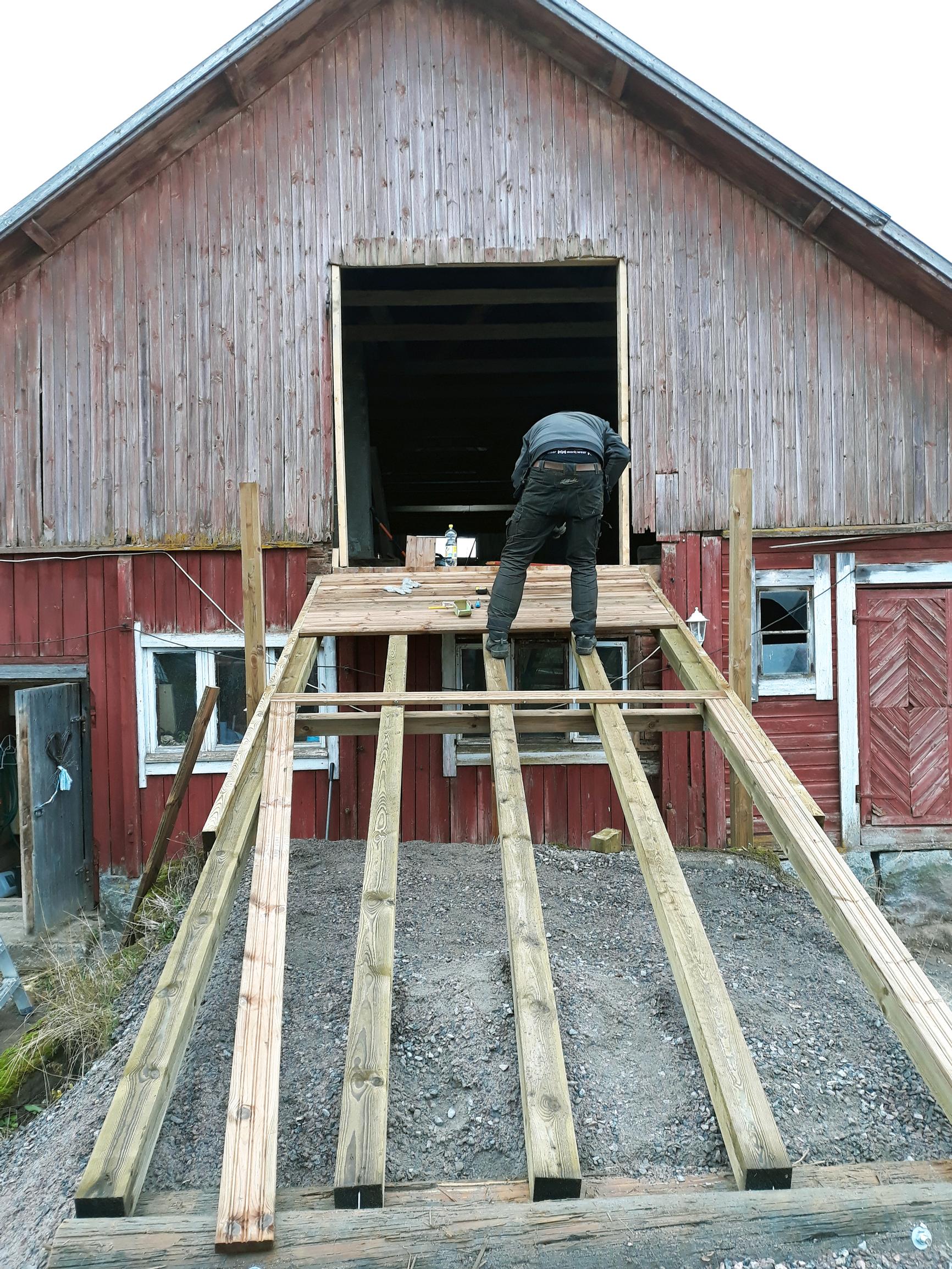 Hyödynsimme mahdollisimman paljon ylisiltä ja muista piharakennuksista löytynyttä puutavaraa. Uutena ostimme ainakin lattialaudat, ulkoverhouspaneelit, ruuvit, lattian ruoteet, kaikki paikallisilta toimijoilta.