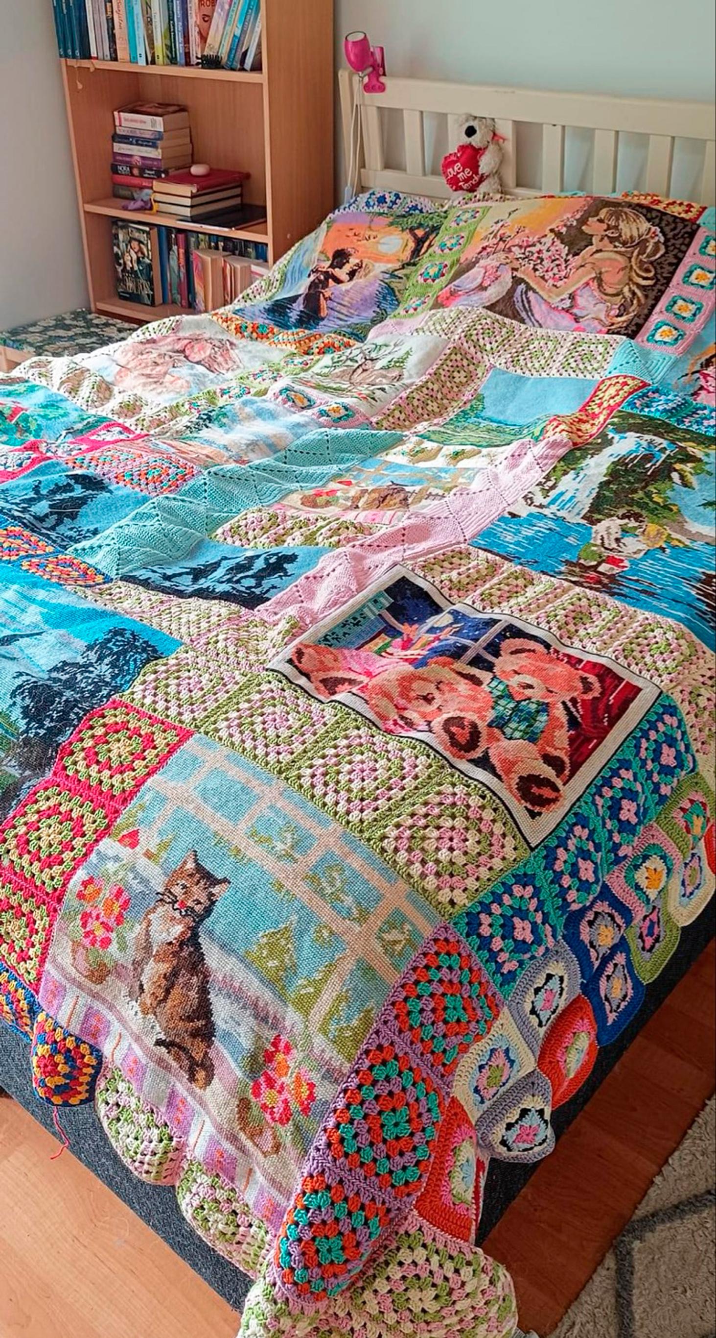 ”Olen aina tykännyt tehdä käsitöitä. Idea tähän päiväpeitteeseen tuli ex tempore, kun sain äidin poismenon jälkeen hänen tekemiään kanavatöitä. Pohdin, kuinka saisin työt hyötykäyttöön, ja siitä se idea lähti. Virkkasin ensin monenlaisia ja -värisiä ruutuja langoista, joita minulla oli kotona. Ehkä jokusen uuden lankavärin ostin. Värit valitsin puhtaasti sen mukaan, mikä miellytti omaa silmääni.