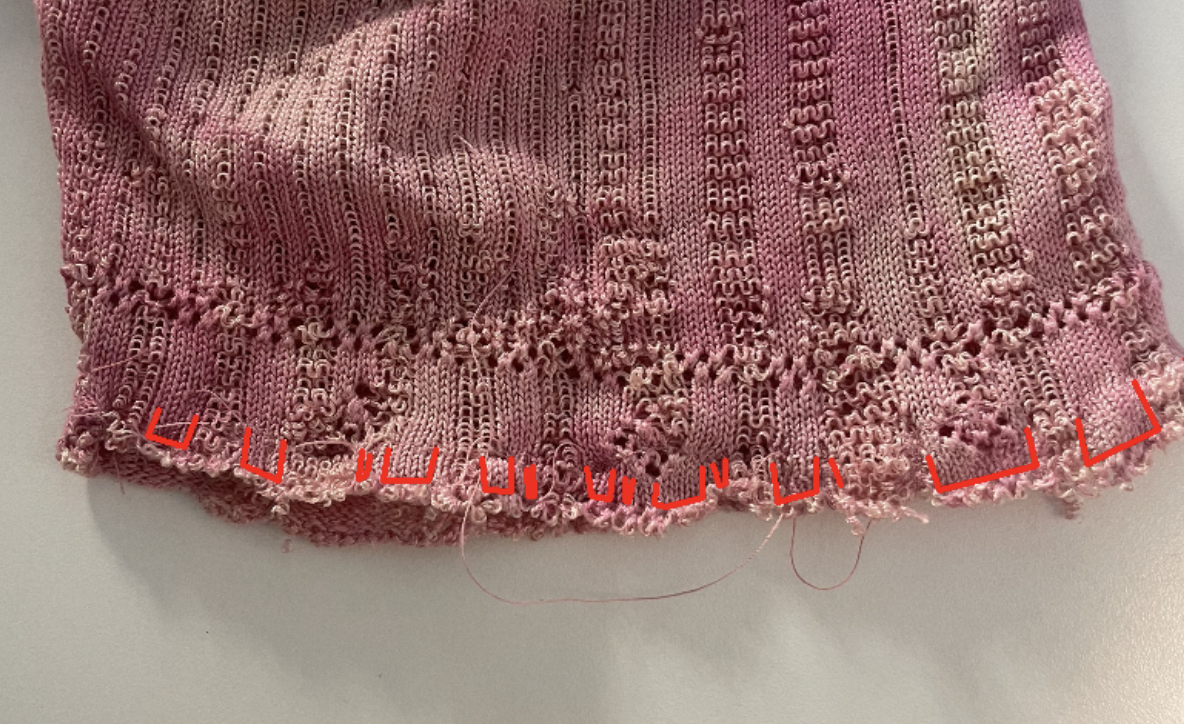 - Ompele hieman yli sauman, jonka vierestä aloitit purkamisen. Tämä varmistaa, että neule pysyy kiinni sauman kohdalta eikä lähde purkautumaan, kuten esimerkkikuvassa on käynyt. Jos silmukat kuitenkin pääsevät purkautumaan, tästä voi muodostua kiinnostava yksityiskohta lopputulokseen.