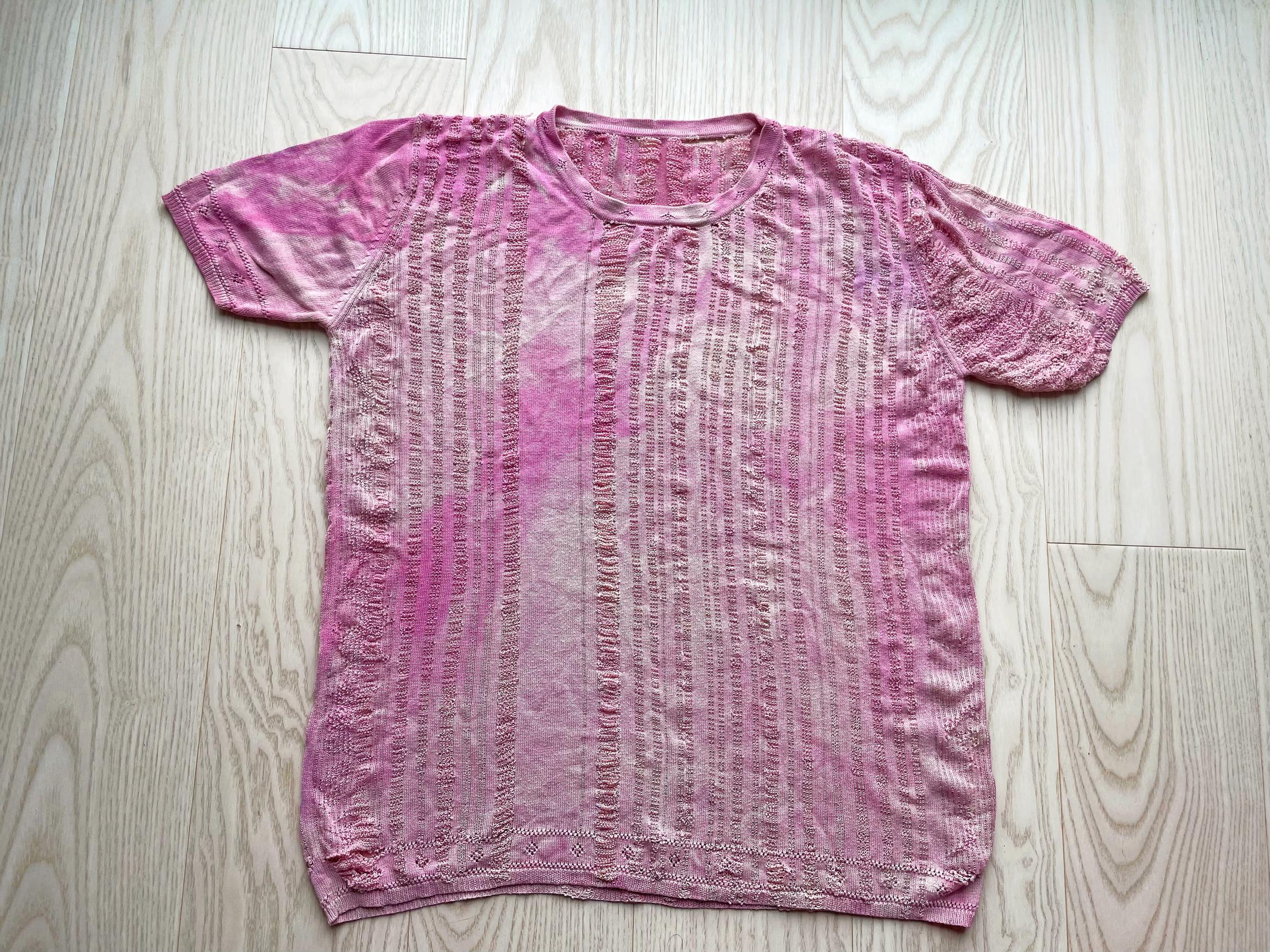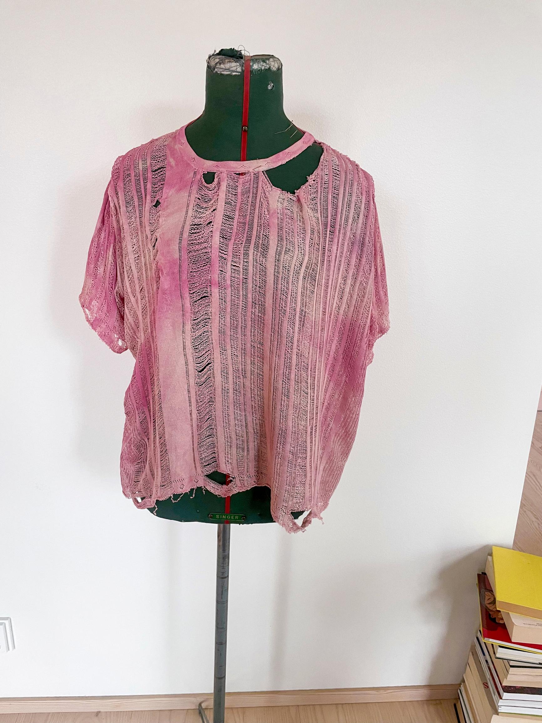 - Ohjeen paidassa silmukoita on purettu sattumanvaraisessa järjestyksessä aina 1–8 kerralla jättäen väliin 3–10 ehjää silmukkaa.