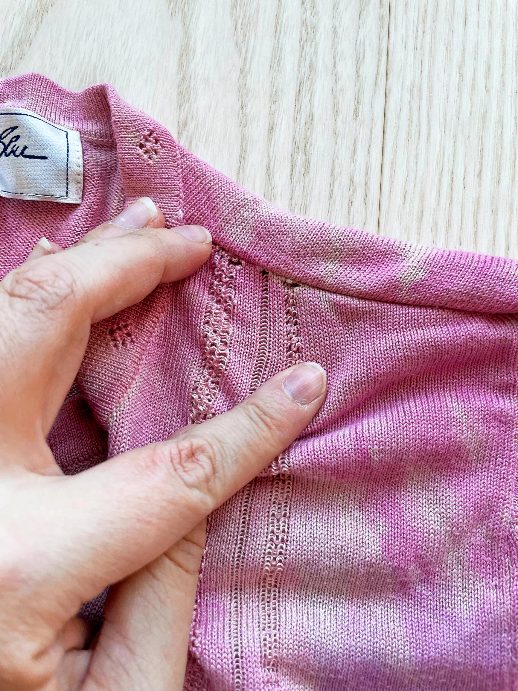 - Solmuvärjäys auttaa peittämään tahrat ja elävöittää väriä. Jos olet tyytyväinen neuleen alkuperäiseen väriin, voit sivuuttaa tämän vaiheen. Vaikka neuleessa olisikin pinttyneitä tahroja, purkamistekniikka rikkoo pintaa ja tekee siitä elävän, jolloin tahrat eivät välttämättä ole niin huomattavia kuin ehjässä pinnassa.