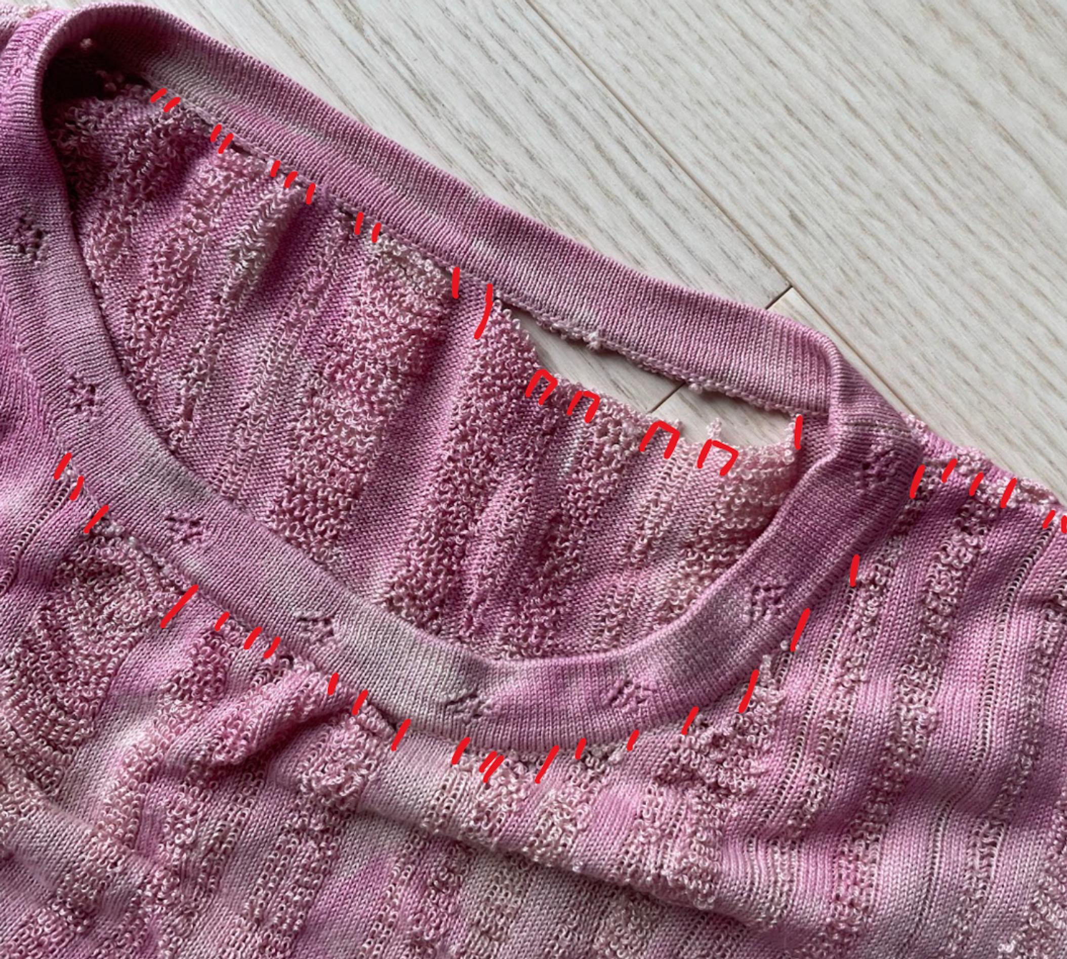 - Ole varovainen, ettei yläreunasta katkaistujen lankojen vierestä tipu silmukoita. Jos materiaali on liukasta ja silmukatmeinaavat lähteä karkailemaan, kannattaa katkaistut langat huolitella ompelukoneella sitä mukaa kun purkaa. Jätä reikien väliin ohuessa neuleessa aina vähintään 3 vierekkäistä ehjää silmukkaa.