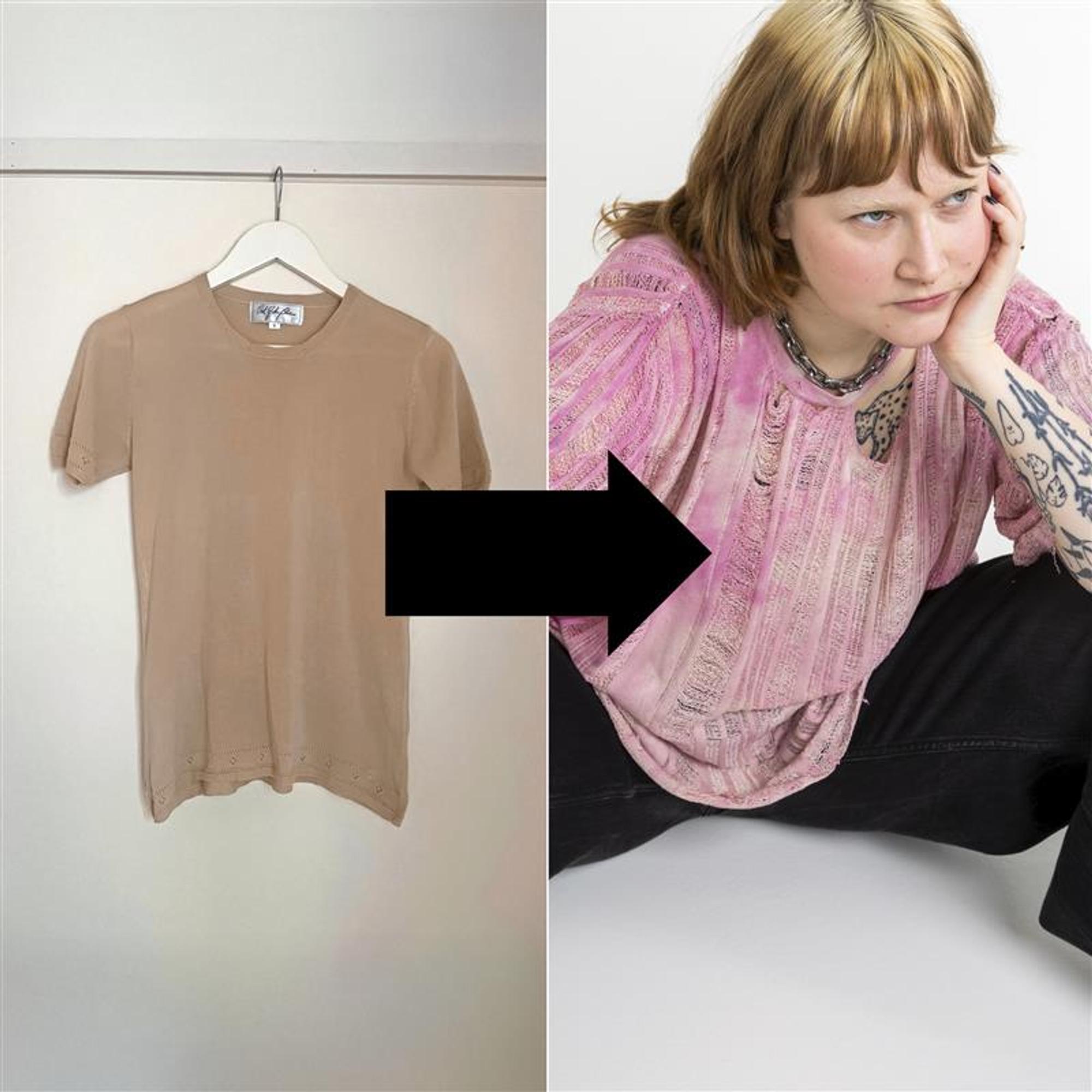 ”Tässä ohjeessa opit hyödyntämään purkamistekniikkaa suoraan vaatteeseen ilman, että vaatteen saumoja tarvitsee purkaa. Tällä tekniikalla saumat pysyvät saman kokoisina eivätkä levene, vaikka purettu pinta levenee ja kasvaa pituutta. Ohjeessa olen myös värjännyt neuleen peittääkseni tahrat ja kulahtaneen värin. Ohjetta varten tulee osata ommella suoraa ommelta ompelukoneella ja hahmottaa mikä on silmukka neuleessa.”