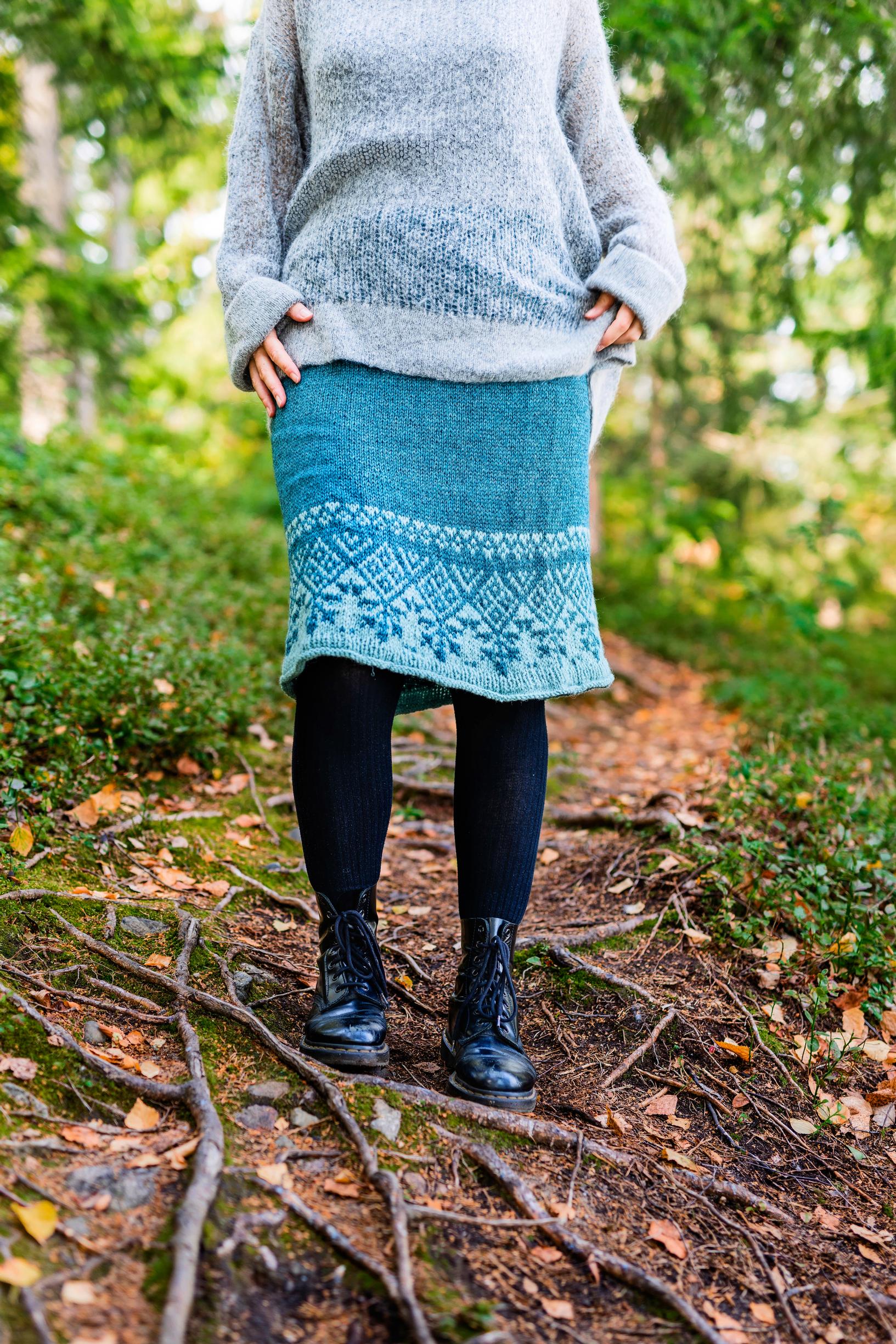 Kalevala-aiheisista neuleistaan tuttu Jenna Kostet suunnitteli hameen, jonka helman kirjoneulekuvio muistuttaa myös islantilaisneuleiden buumista.